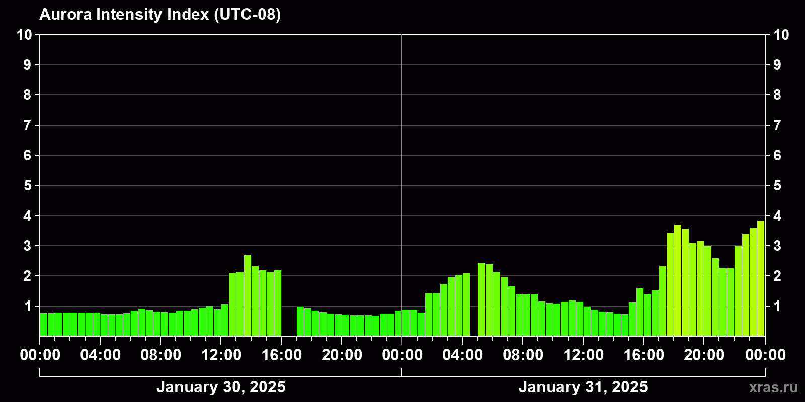 Changes in the auroral intensity index from 2025-01-30 to 2025-01-31 local time