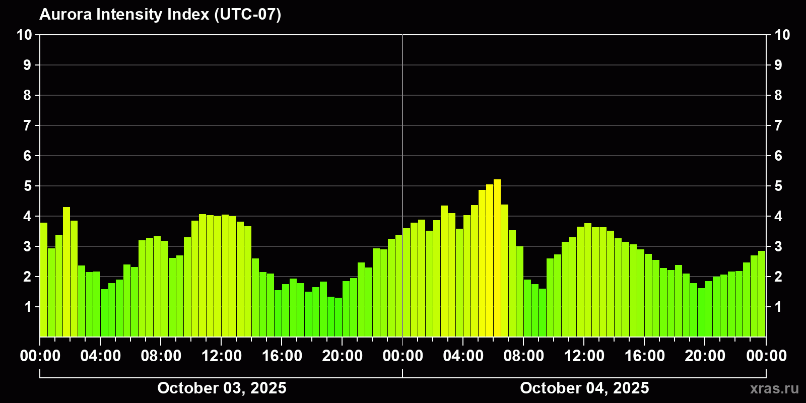 Auroral intensity index and the theoretically possible latitude of observations for nighttime in the Western Hemisphere as of 2025-10-04 23:59 (end of day) local time