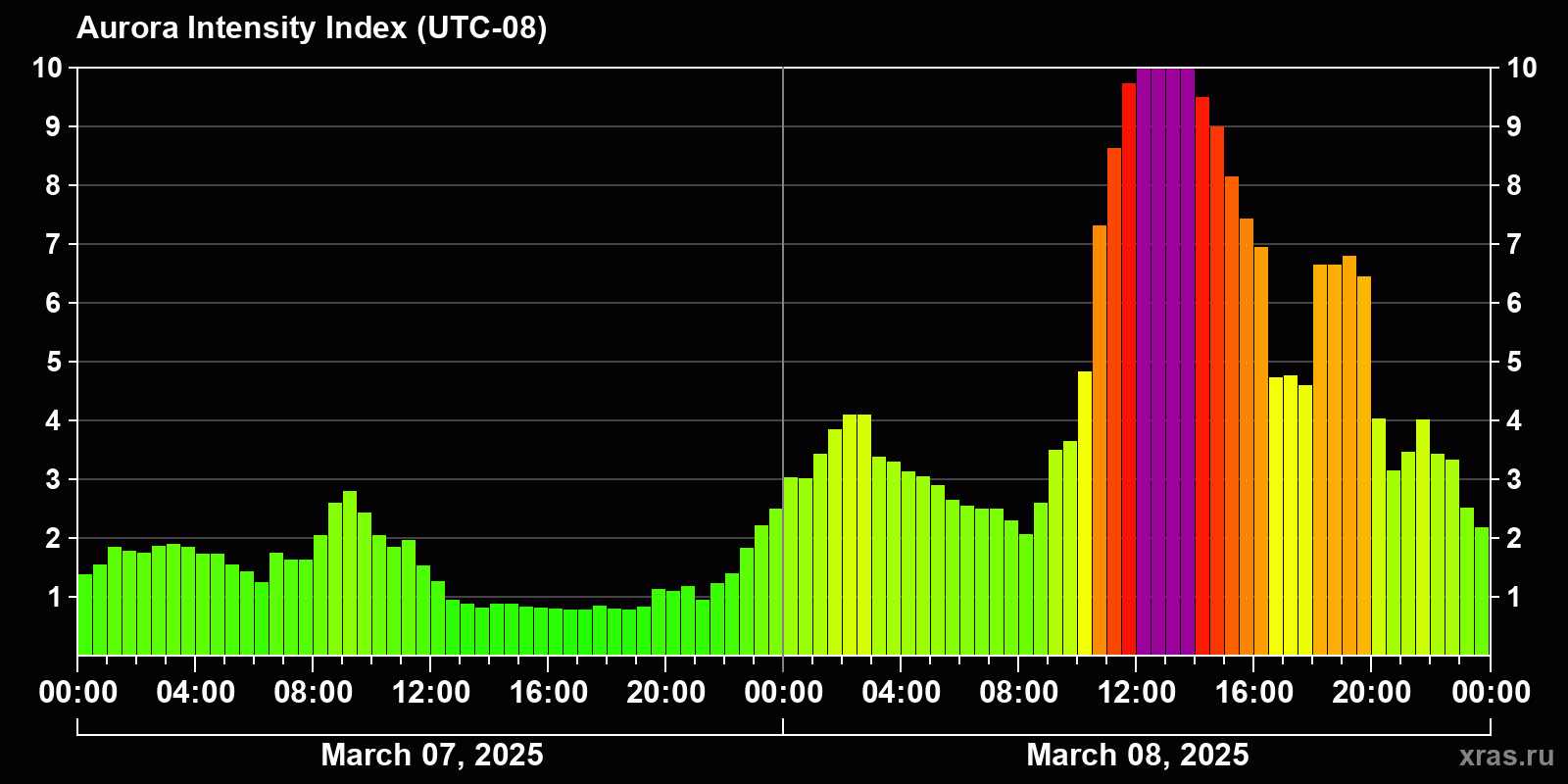 Changes in the auroral intensity index from 2025-03-07 to 2025-03-08 local time