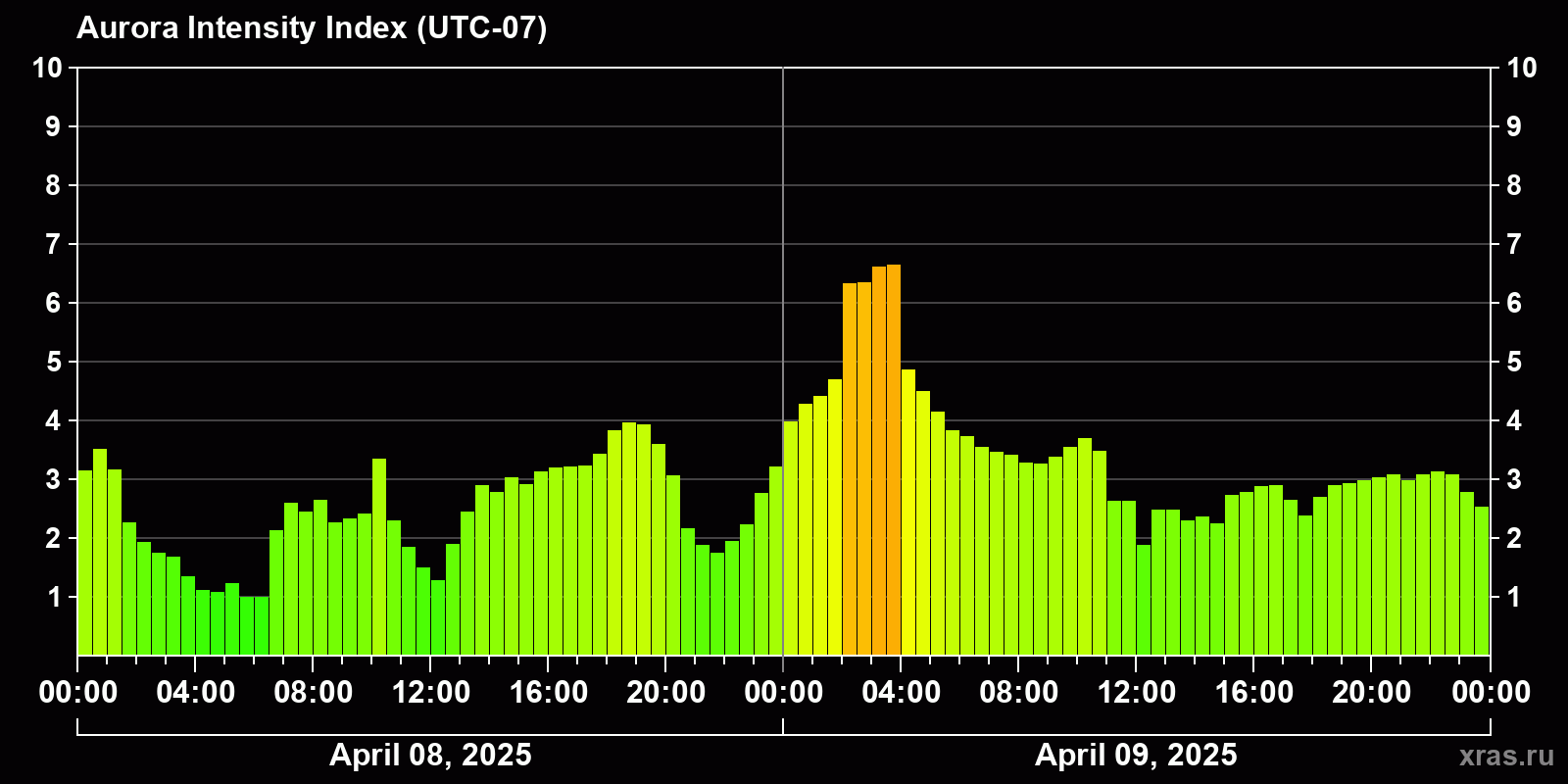 Auroral intensity index and the theoretically possible latitude of observations for nighttime in the Western Hemisphere as of 2025-04-09 23:47 (end of day) local time