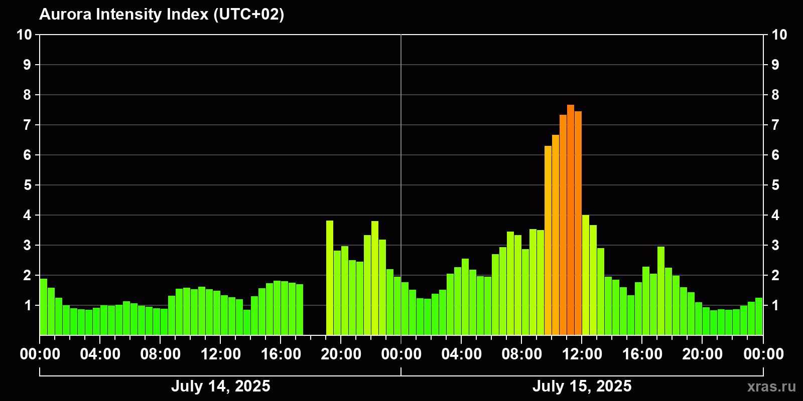 Changes in the auroral intensity index from 2025-07-14 to 2025-07-15 local time