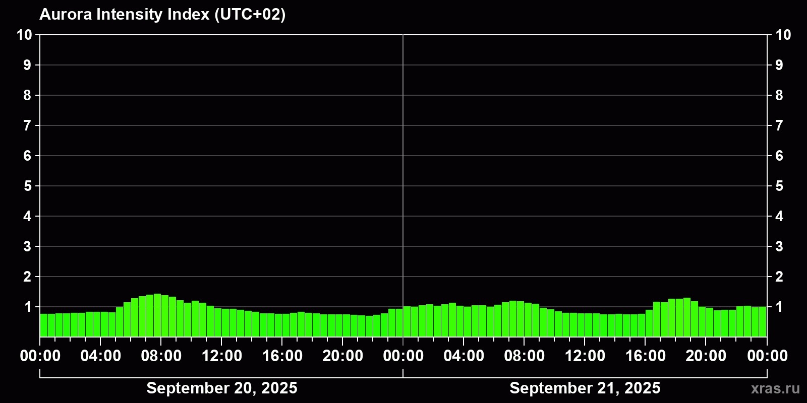 Changes in the auroral intensity index from 2025-09-20 to 2025-09-21 local time