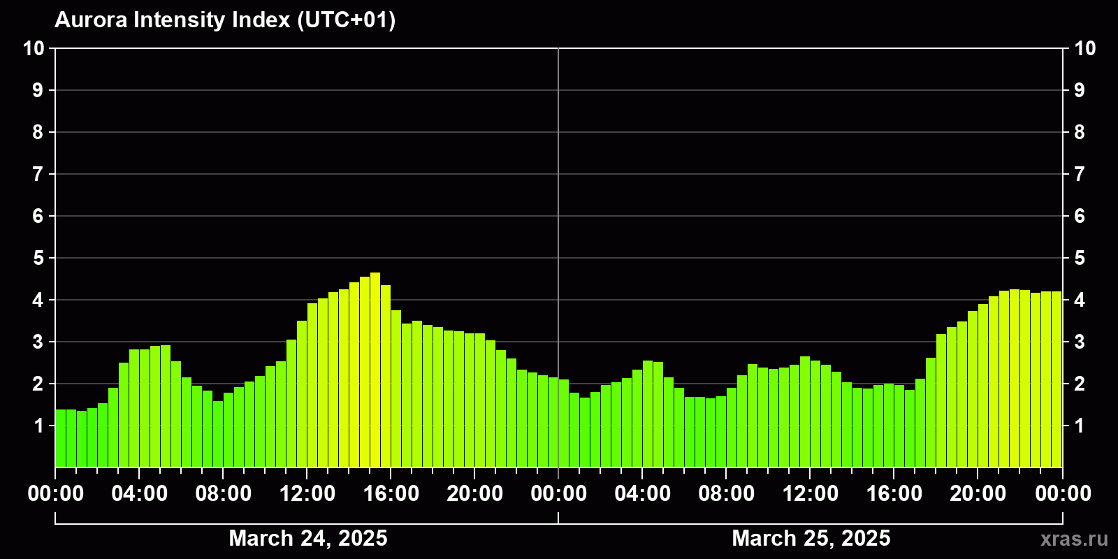 Auroral intensity index and the theoretically possible latitude of observations for nighttime in the Estern Hemisphere as of 2025-03-25 23:50 (end of day) local time