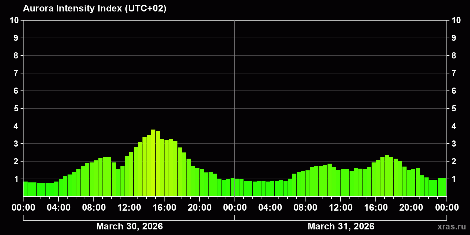 Changes in the auroral intensity index from 2026-03-30 to 2026-03-31 local time