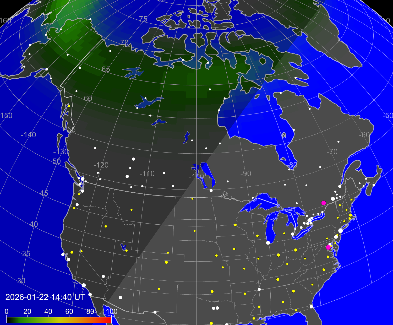Вероятность полярных сияний в городах США