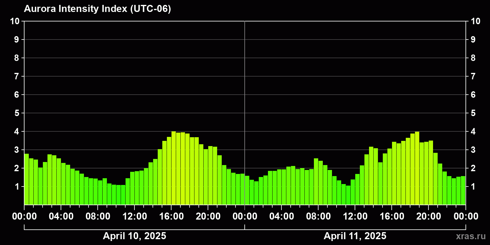 Auroral intensity index and the theoretically possible latitude of observations for nighttime in the Western Hemisphere as of 2025-04-11 23:50 (end of day) local time