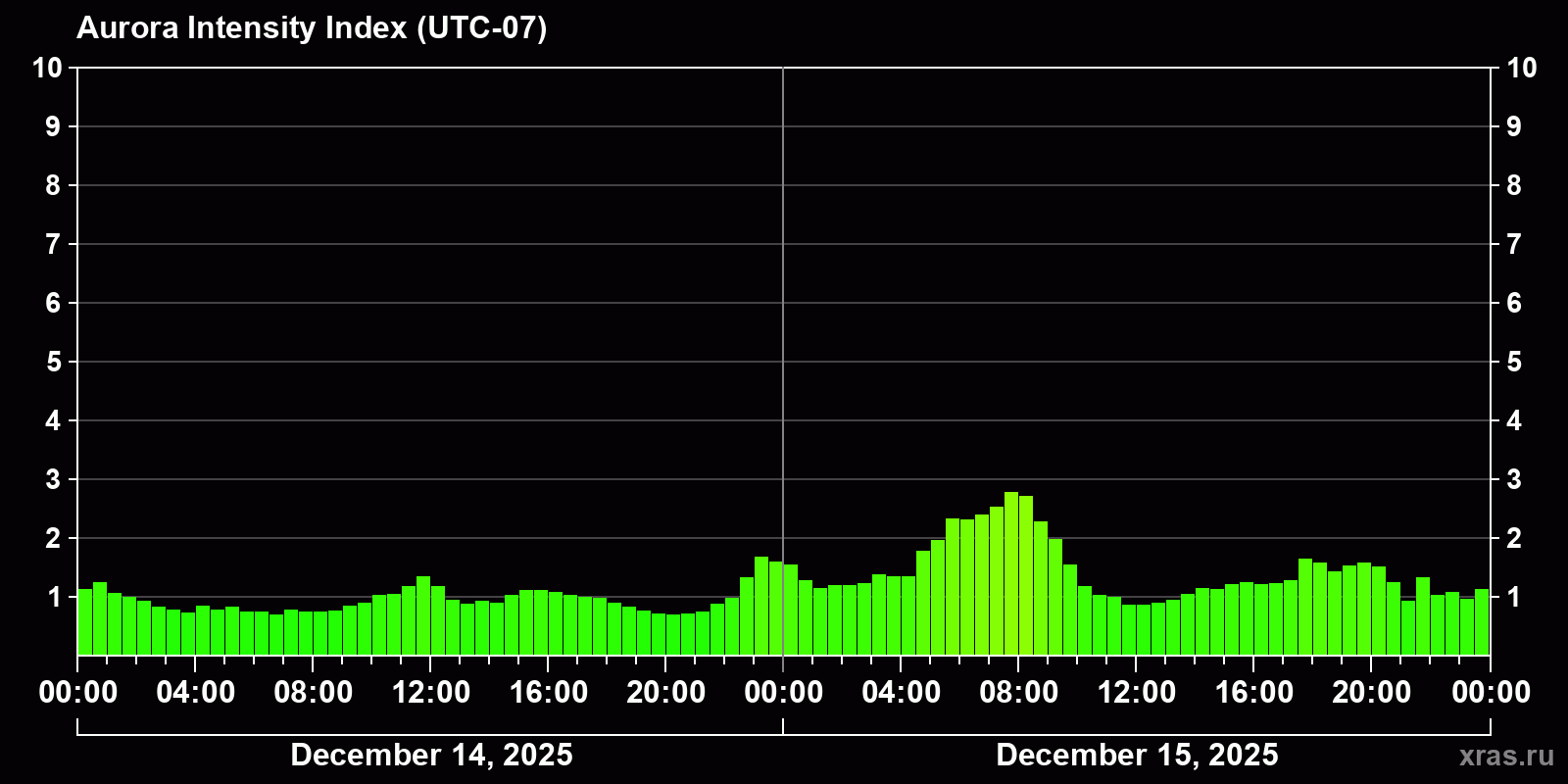 Changes in the auroral intensity index from 2025-12-14 to 2025-12-15 local time
