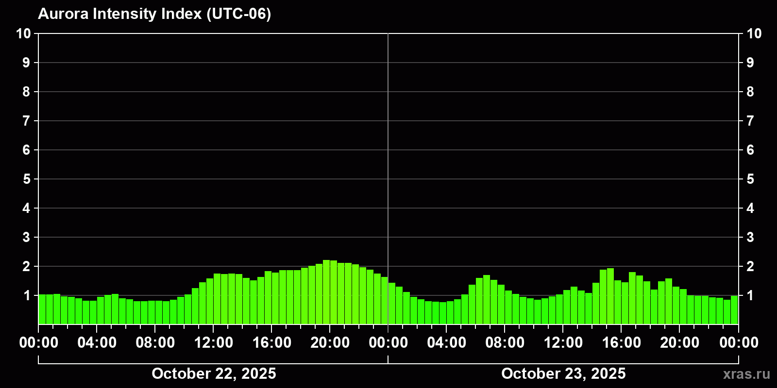Auroral intensity index and the theoretically possible latitude of observations for nighttime in the Western Hemisphere as of 2025-10-23 23:55 (end of day) local time