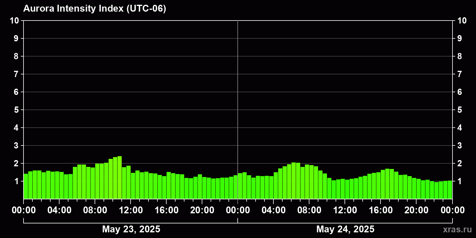 Auroral intensity index and the theoretically possible latitude of observations for nighttime in the Western Hemisphere as of 2025-05-24 23:45 (end of day) local time