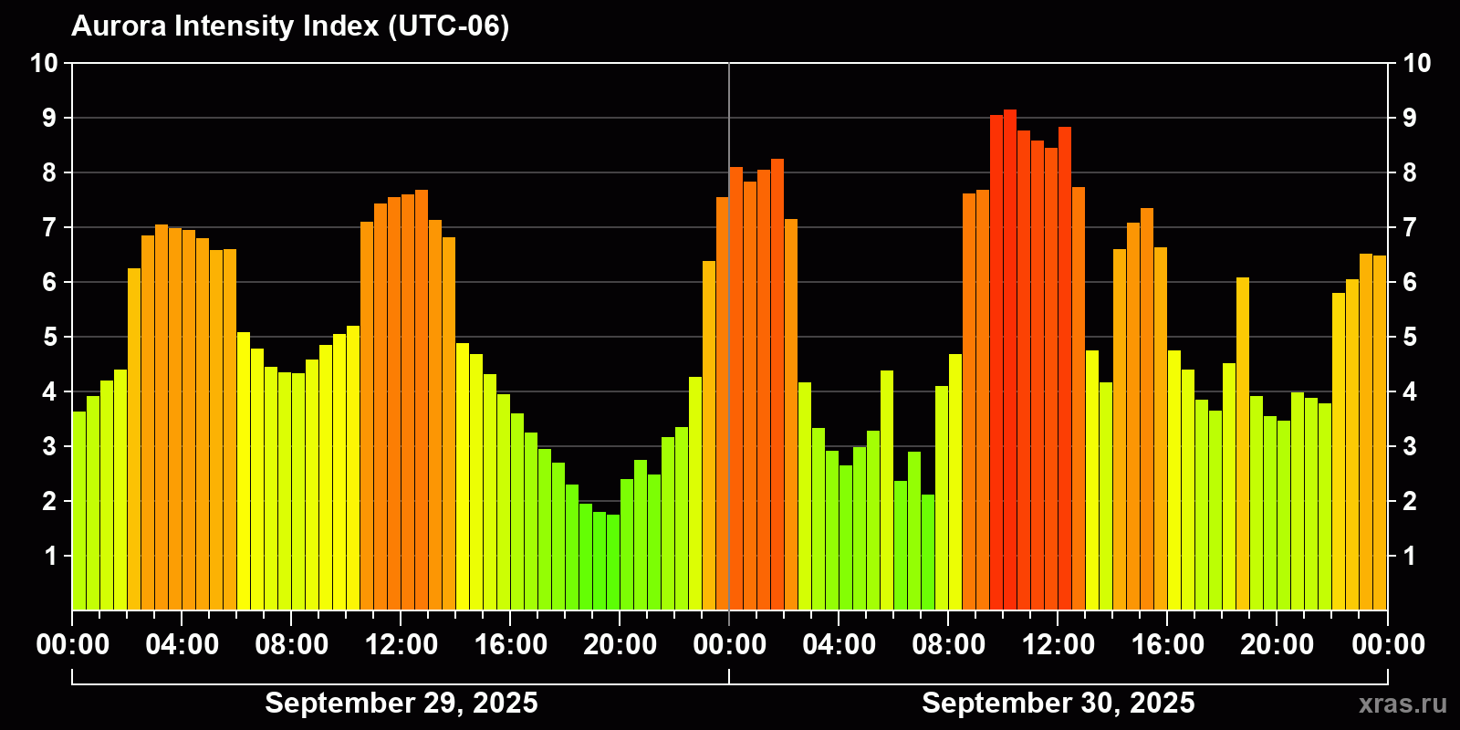 Changes in the auroral intensity index from 2025-09-29 to 2025-09-30 local time