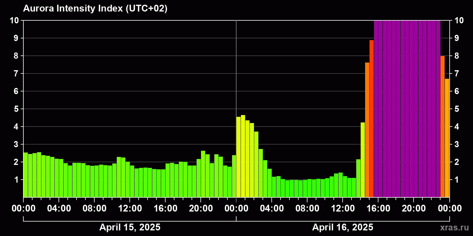 Changes in the auroral intensity index from 2025-04-15 to 2025-04-16 local time