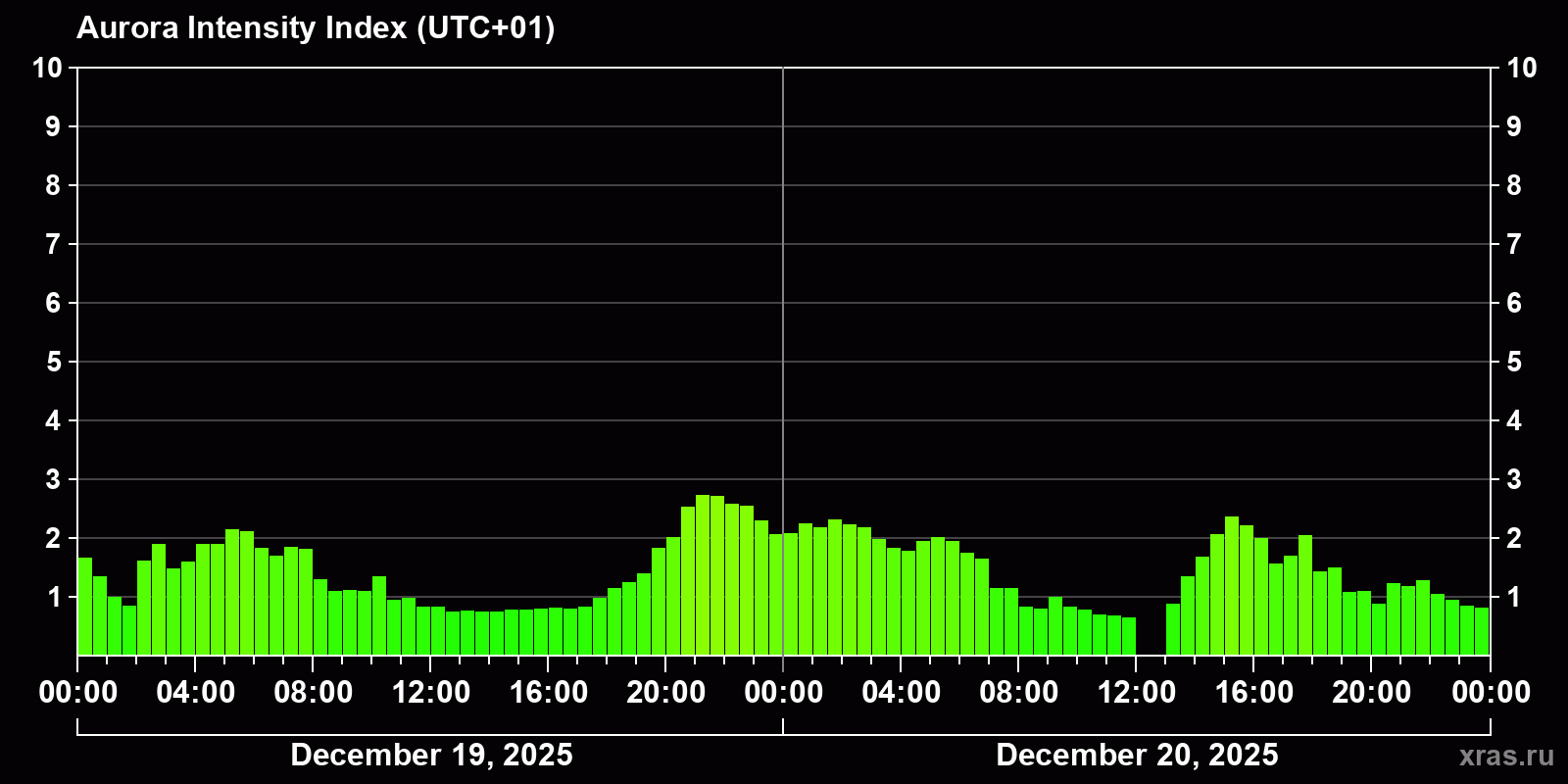 Auroral intensity index and the theoretically possible latitude of observations for nighttime in the Estern Hemisphere as of 2025-12-20 23:59 (end of day) local time