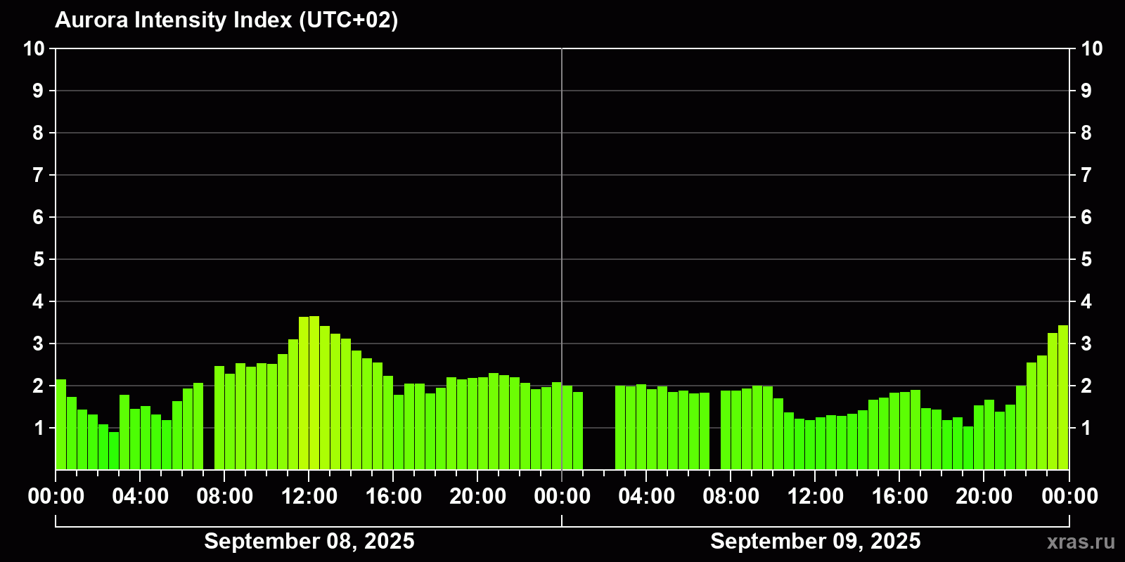 Auroral intensity index and the theoretically possible latitude of observations for nighttime in the Estern Hemisphere as of 2025-09-09 23:46 (end of day) local time