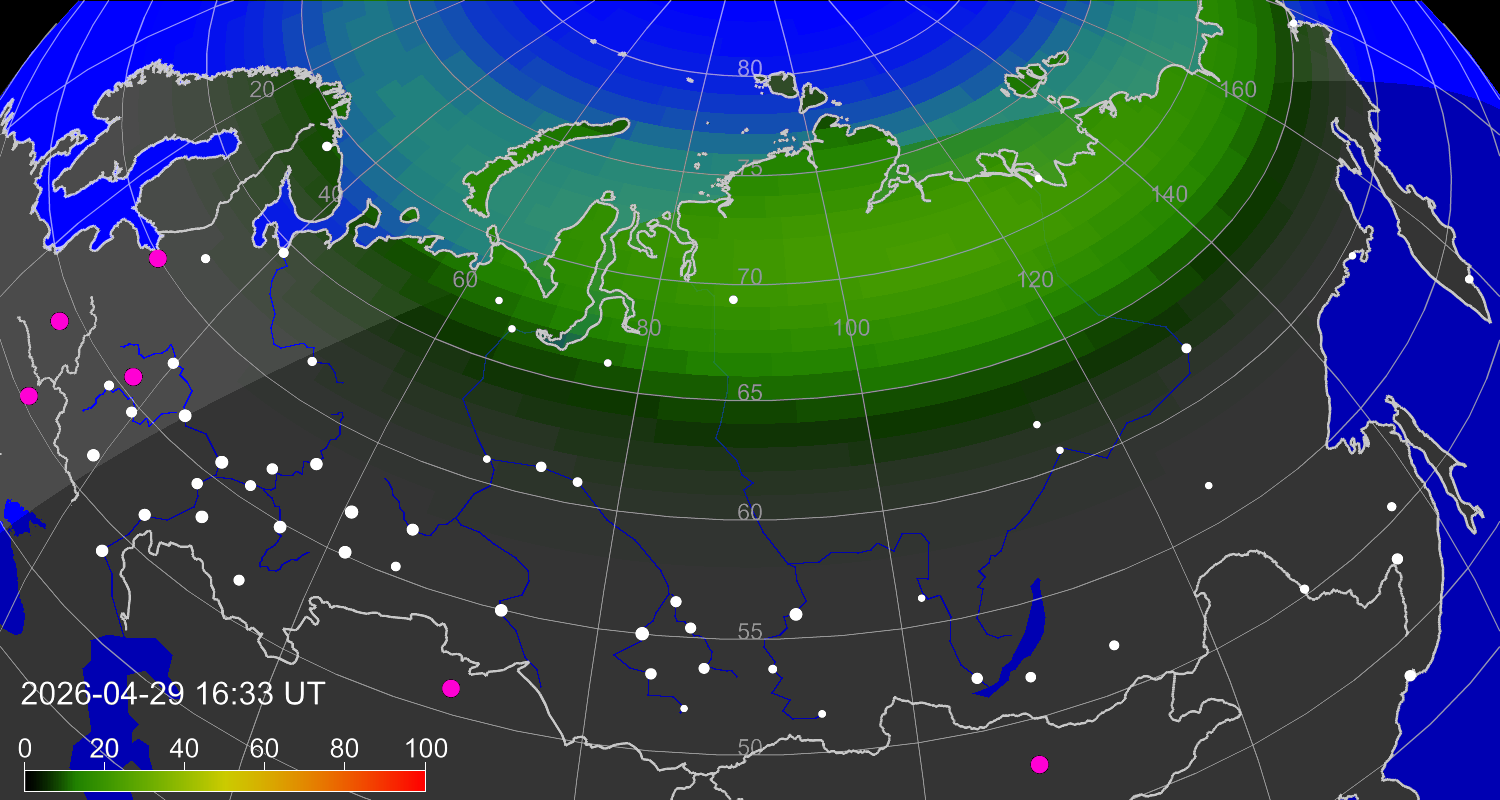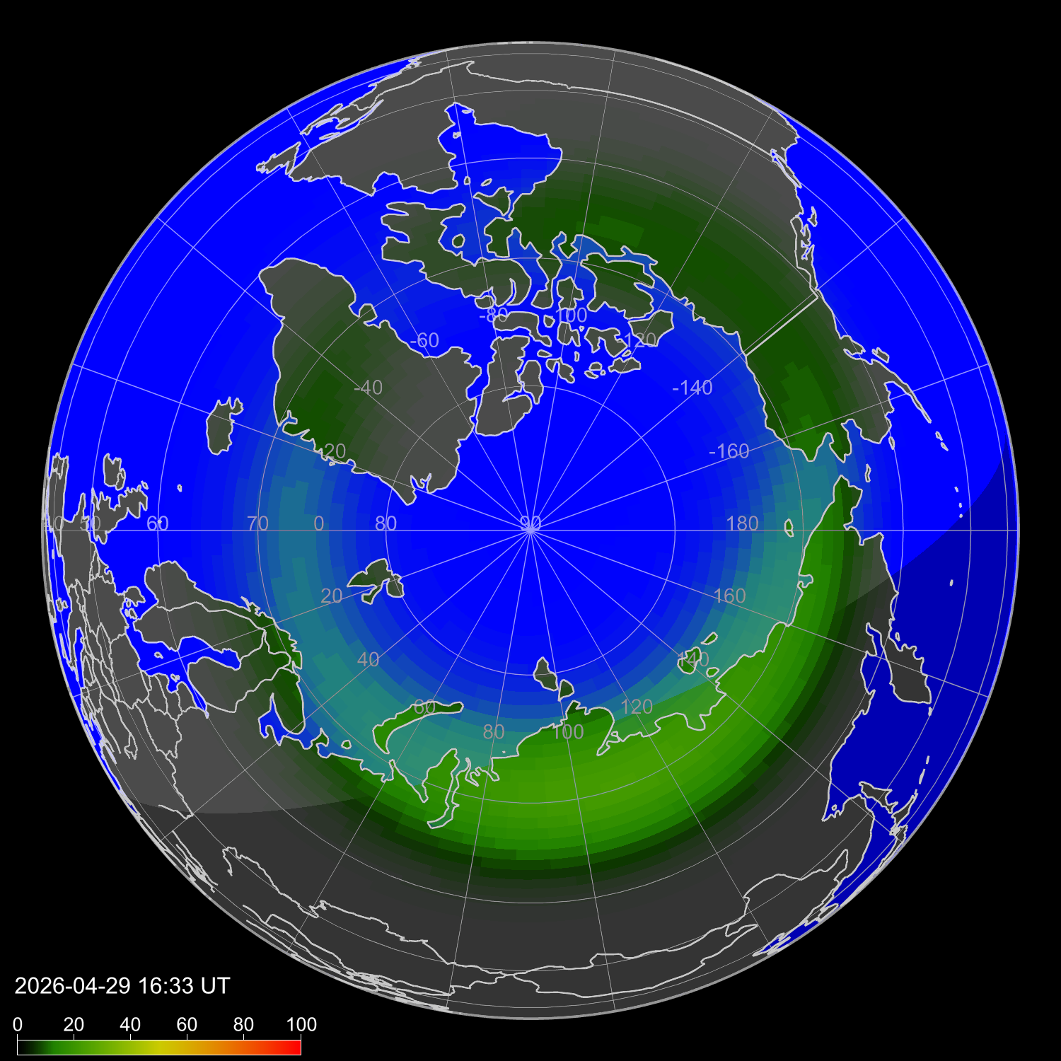 Auroral intensity index and theoretically possible latitude of observations for nighttime in the Estern Hemisphere