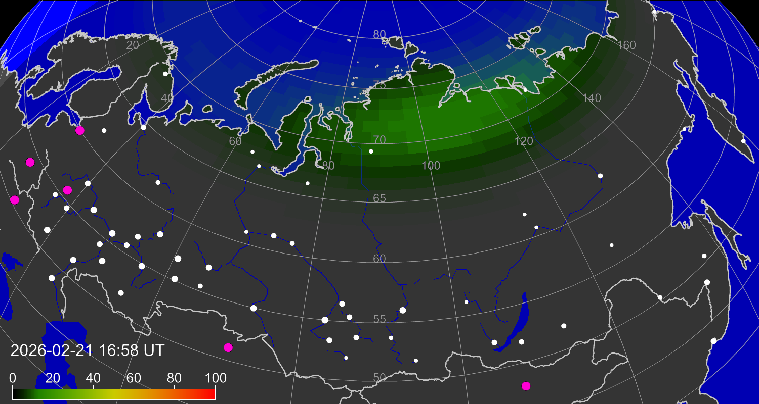Индекс интенсивности полярных сияний и теоретически возможная широта наблюдений для ночного времени в восточном полушарии