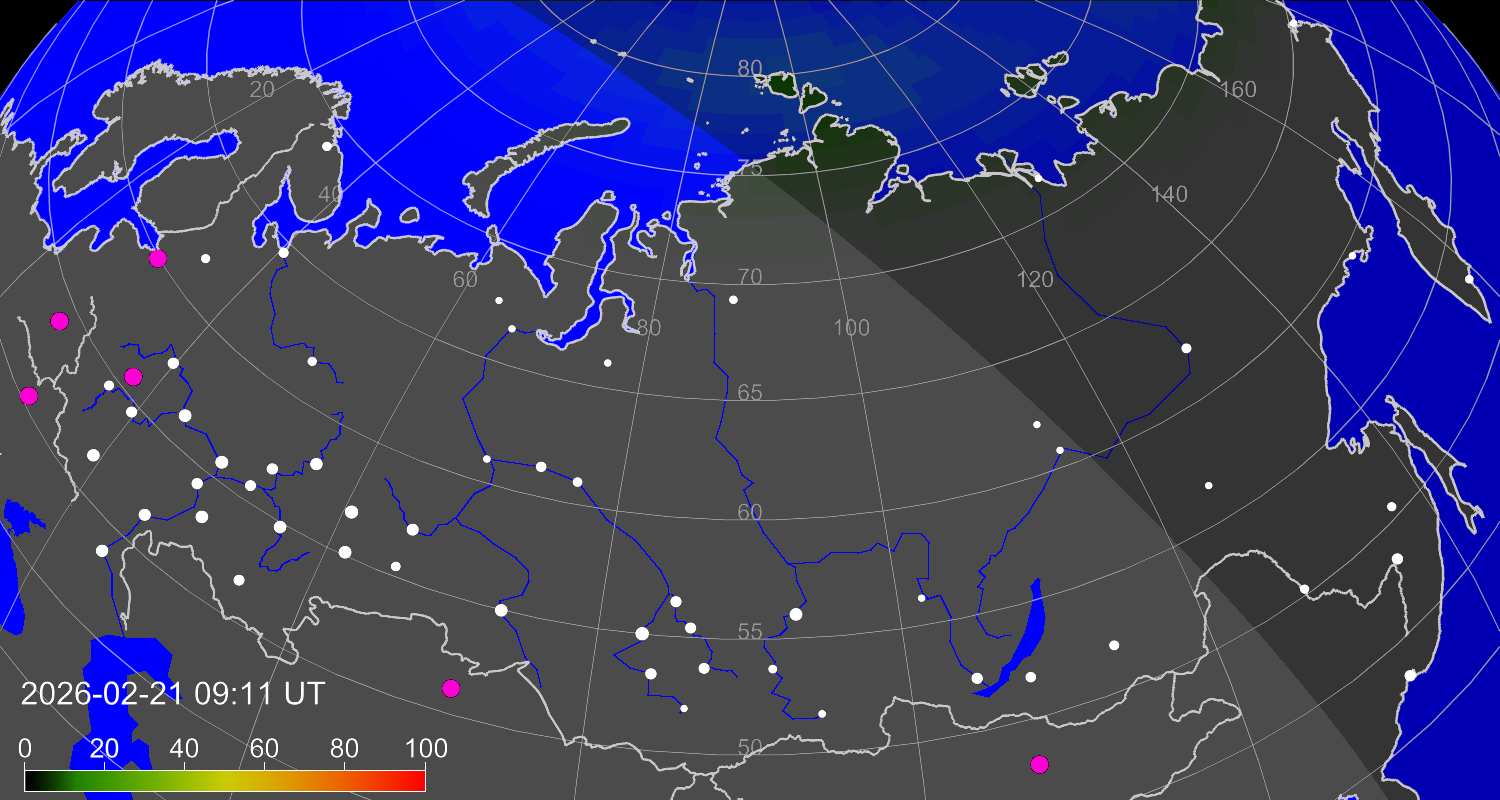 Вероятность полярных сияний в городах Российской Федерации