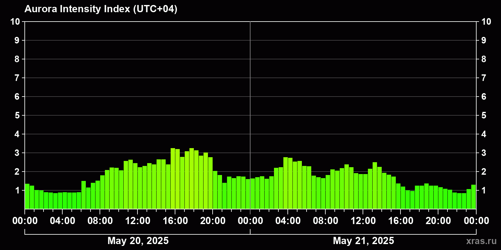 Auroral intensity index and the theoretically possible latitude of observations for nighttime in the Estern Hemisphere as of 2025-05-21 23:55 (end of day) local time