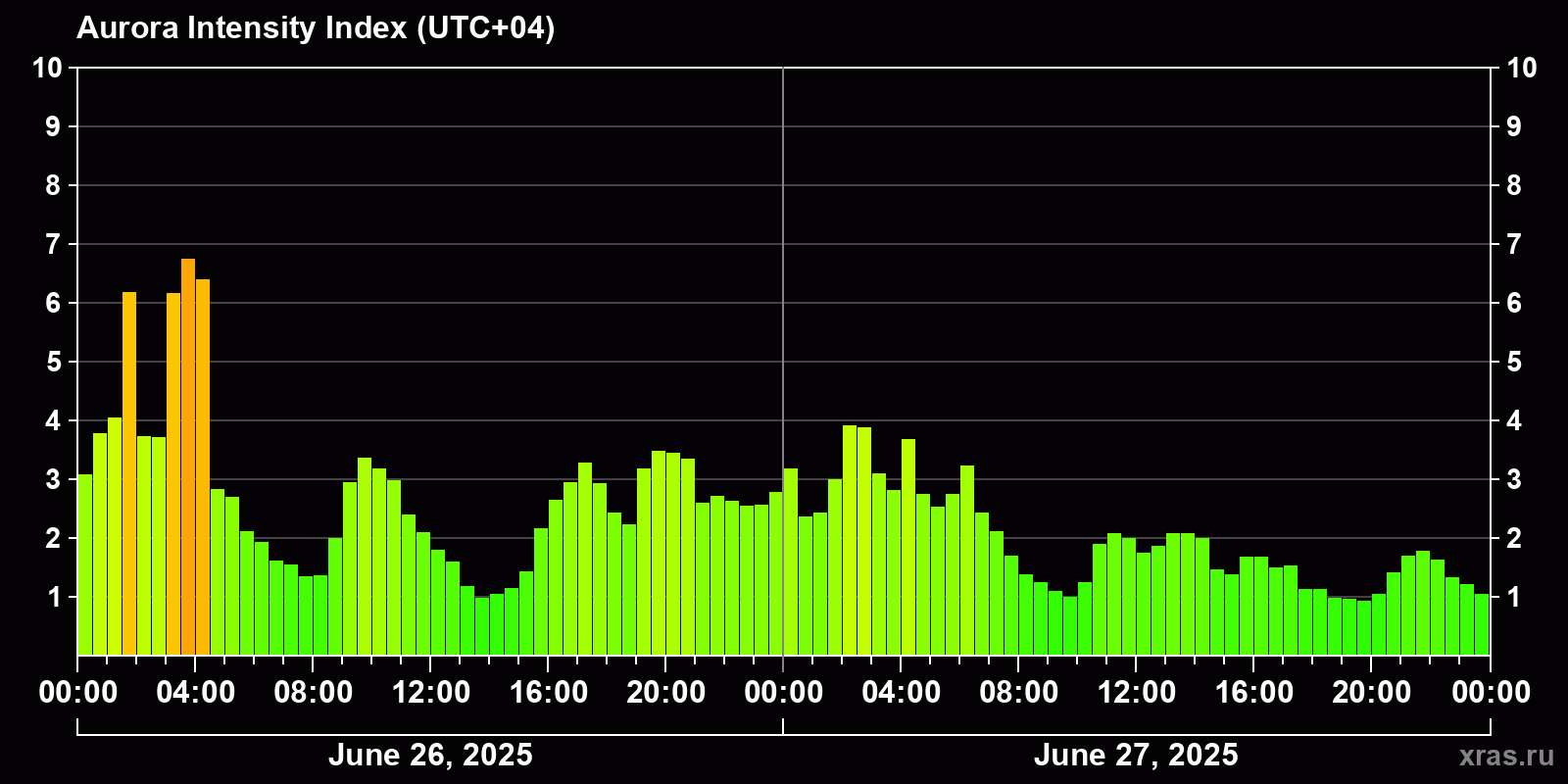 Auroral intensity index and the theoretically possible latitude of observations for nighttime in the Estern Hemisphere as of 2025-06-27 23:54 (end of day) local time
