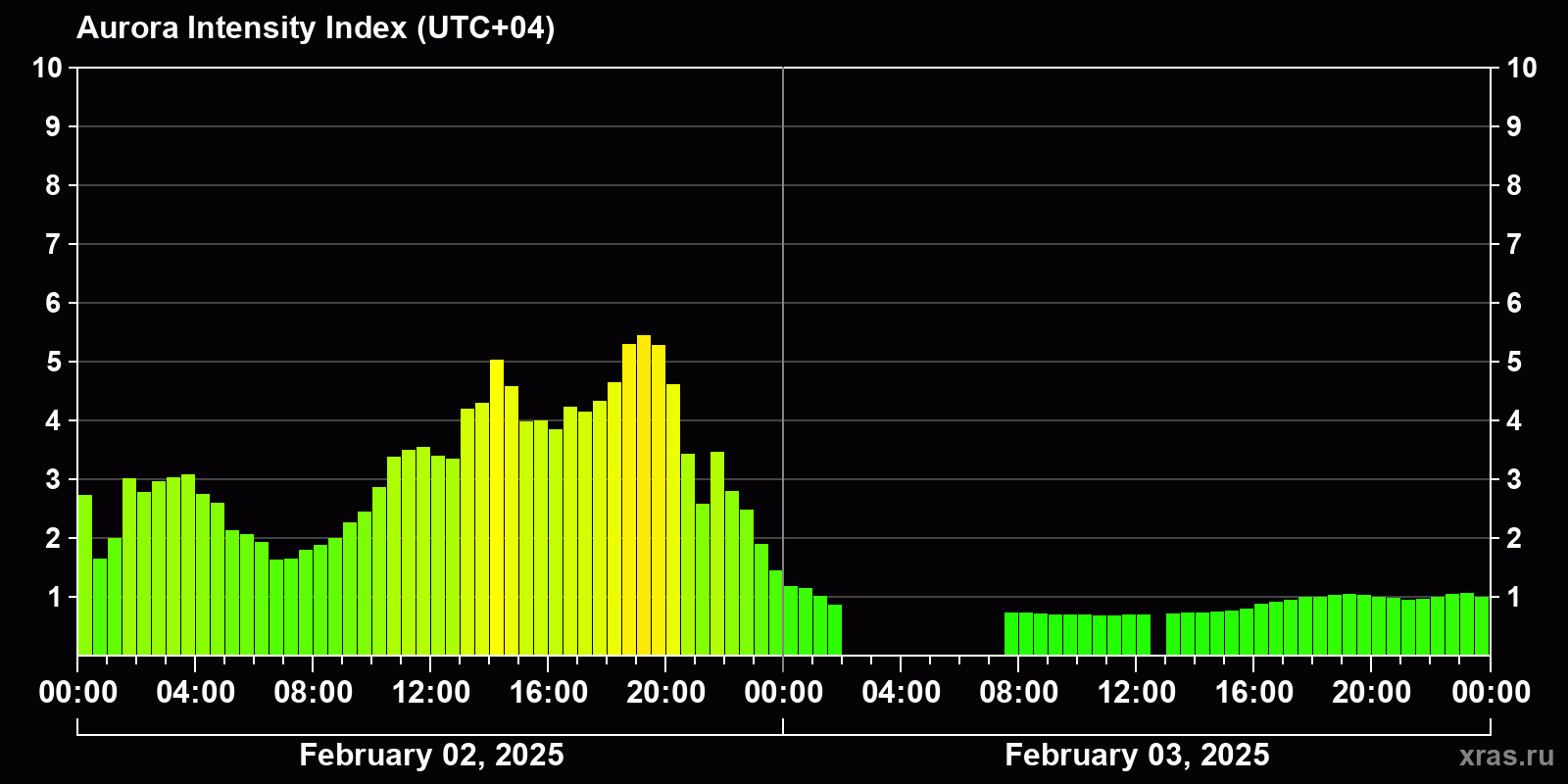 Auroral intensity index and the theoretically possible latitude of observations for nighttime in the Estern Hemisphere as of 2025-02-03 23:55 (end of day) local time