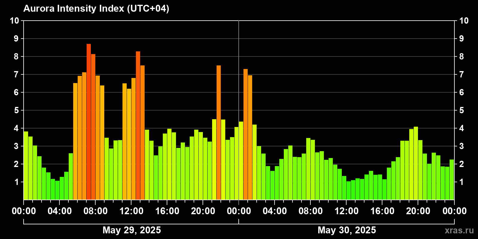 Auroral intensity index and the theoretically possible latitude of observations for nighttime in the Estern Hemisphere as of 2025-05-30 23:58 (end of day) local time