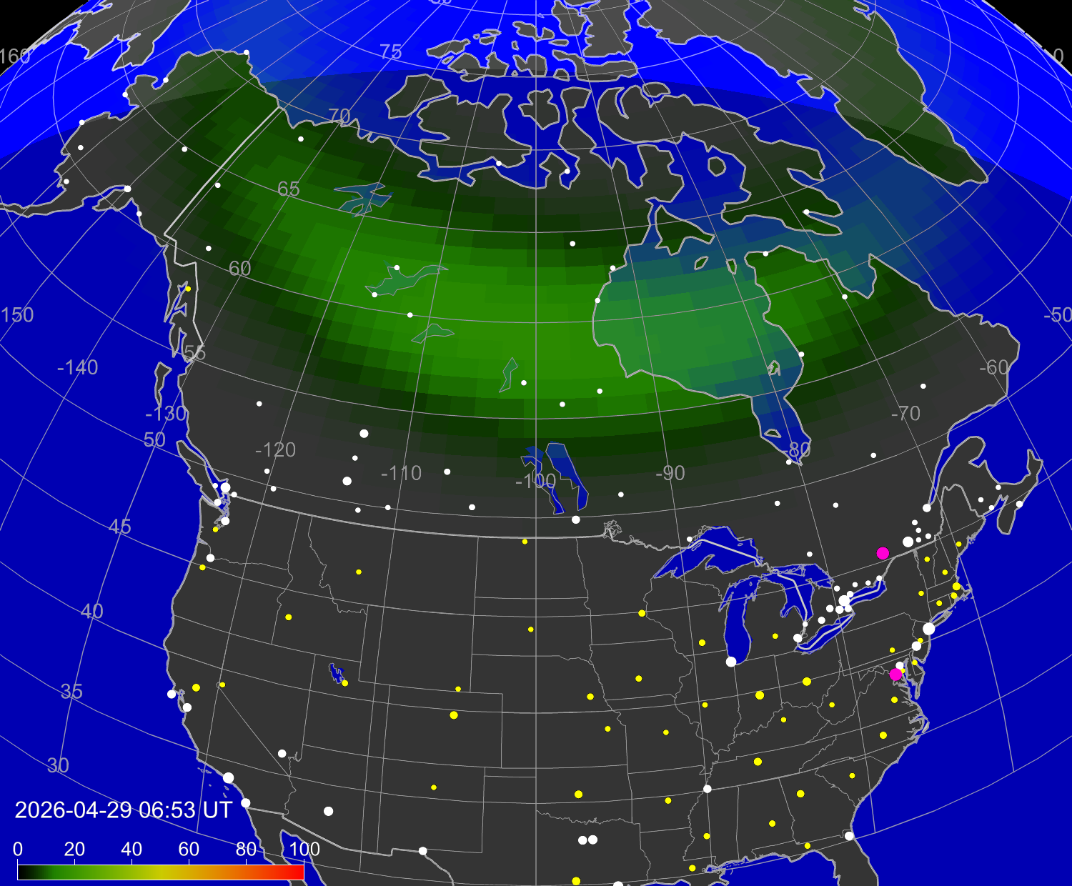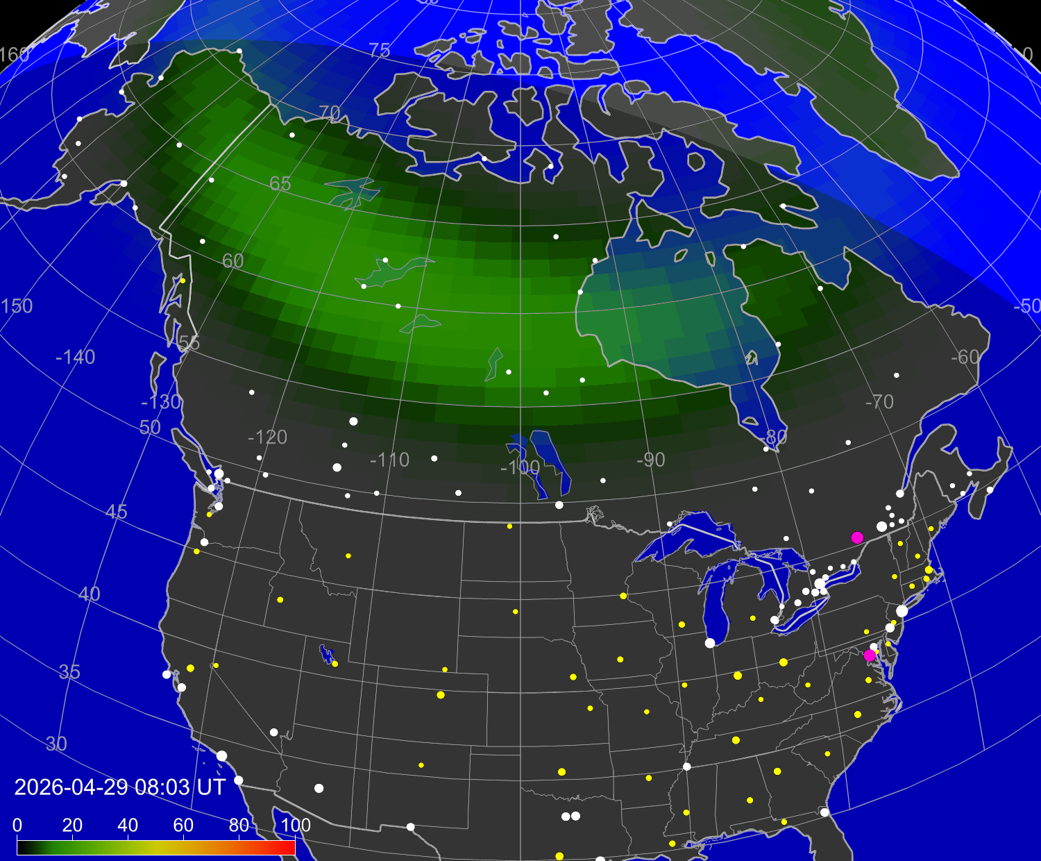 Probability of northern lights (auroras) in cities of Canada