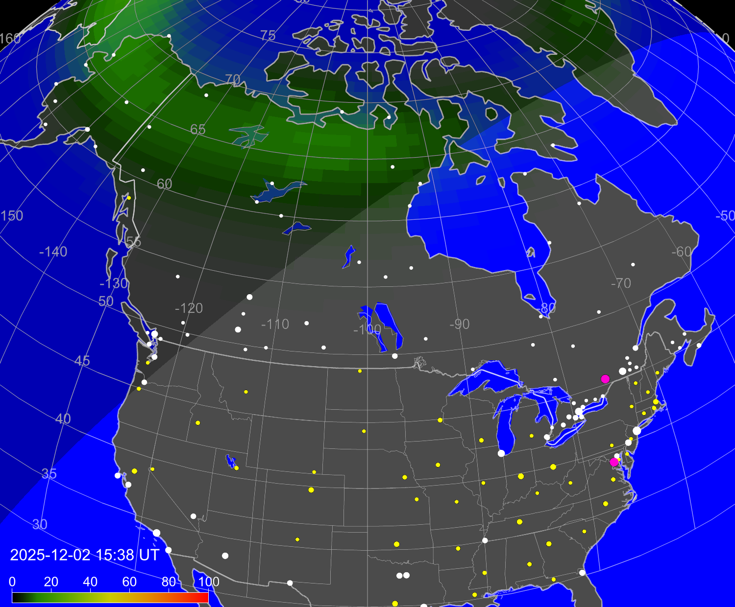 Индекс интенсивности полярных сияний и теоретически возможная широта наблюдений для ночного времени в западном полушарии