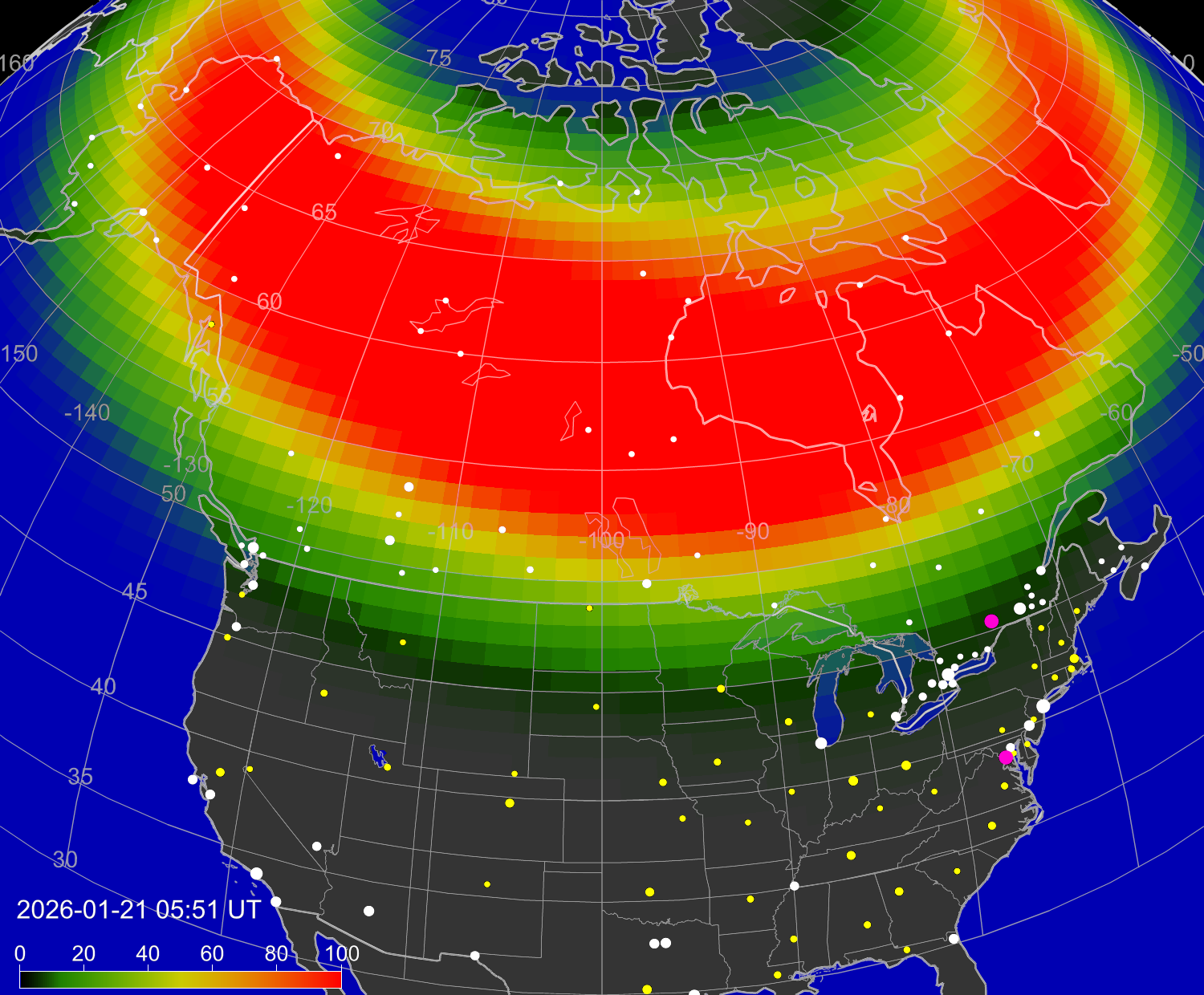 Изменения и часовой прогноз индекса интенсивности полярных сияний с 2026-01-20 по 2026-01-21