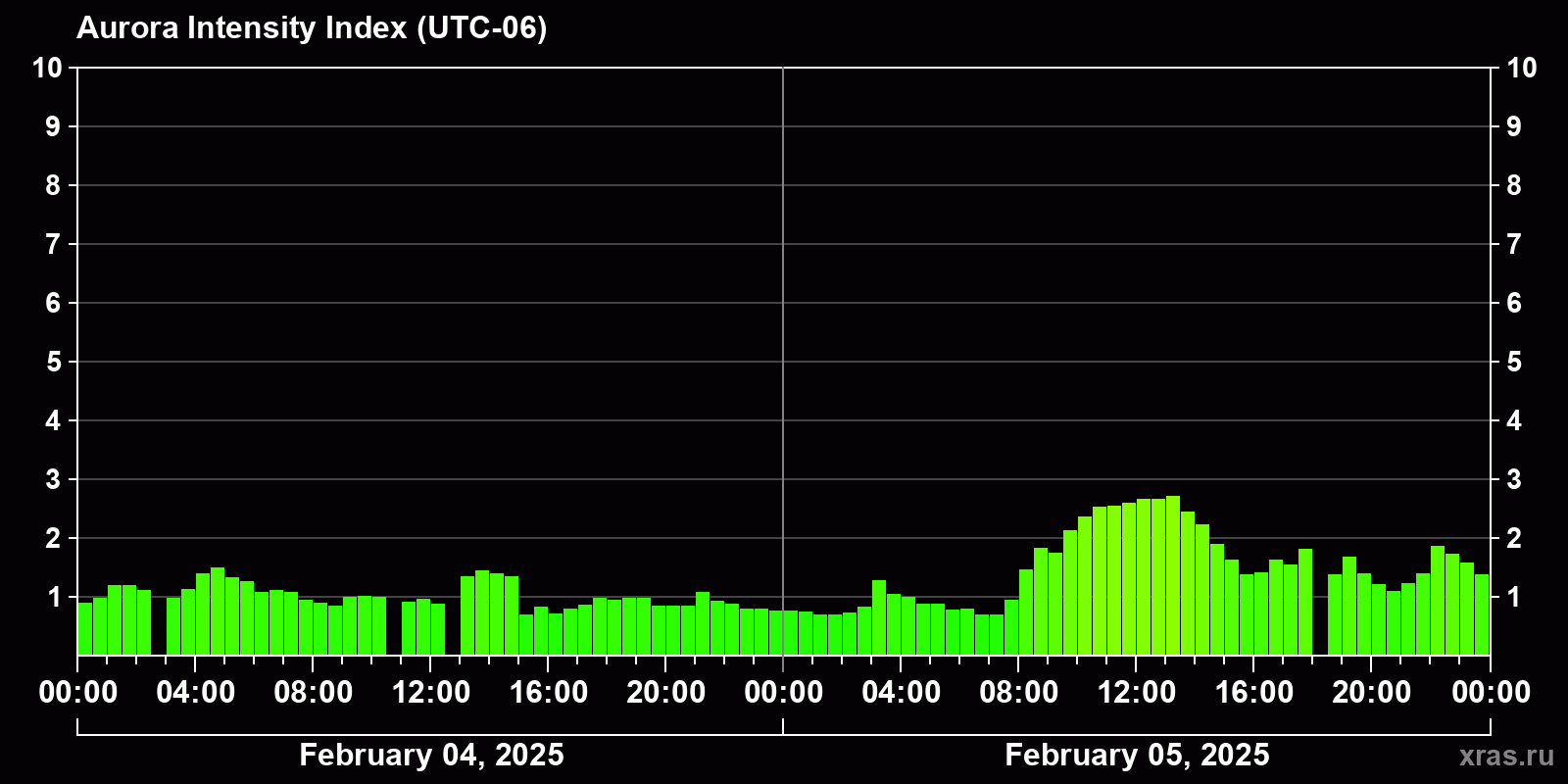 Auroral intensity index and the theoretically possible latitude of observations for nighttime in the Western Hemisphere as of 2025-02-05 23:47 (end of day) local time