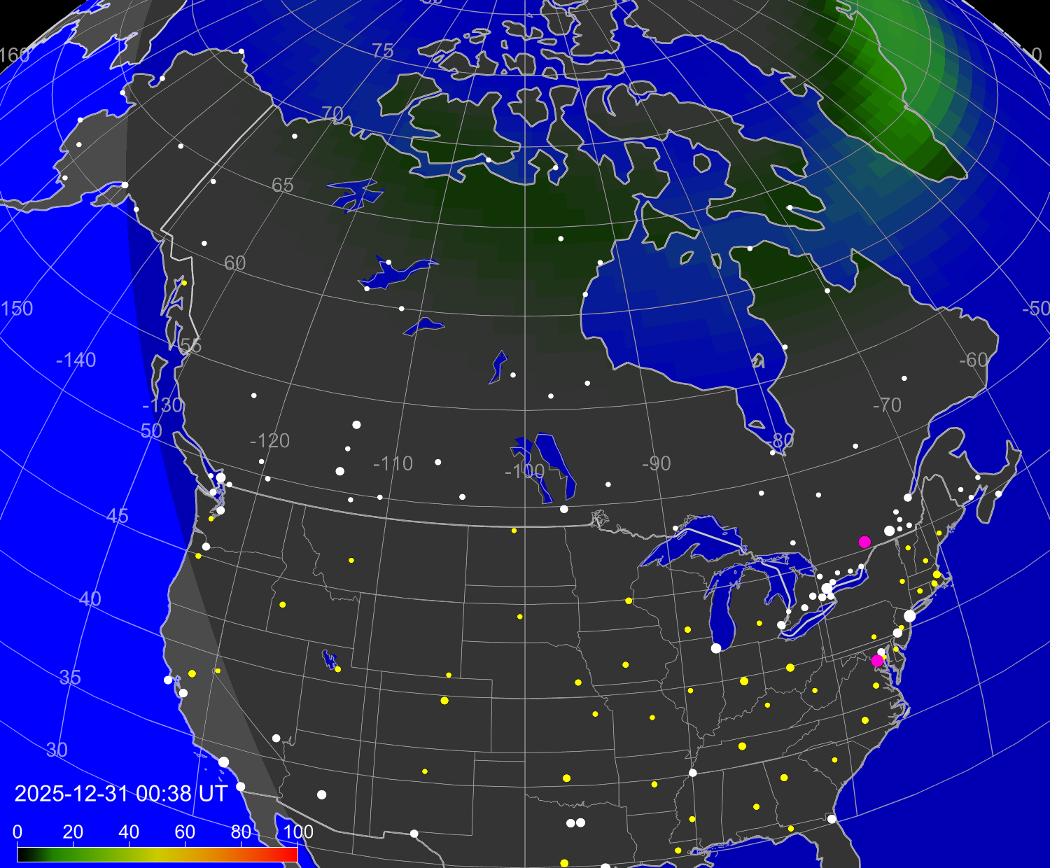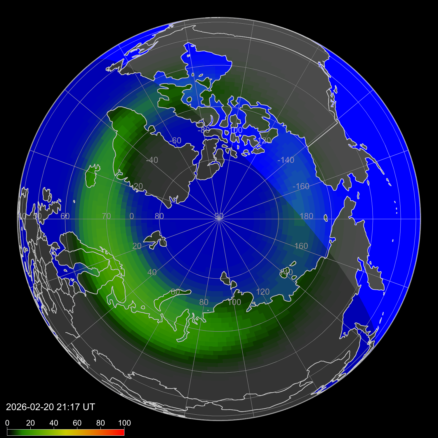 Индекс интенсивности полярных сияний и теоретически возможная широта наблюдений для ночного времени в западном полушарии