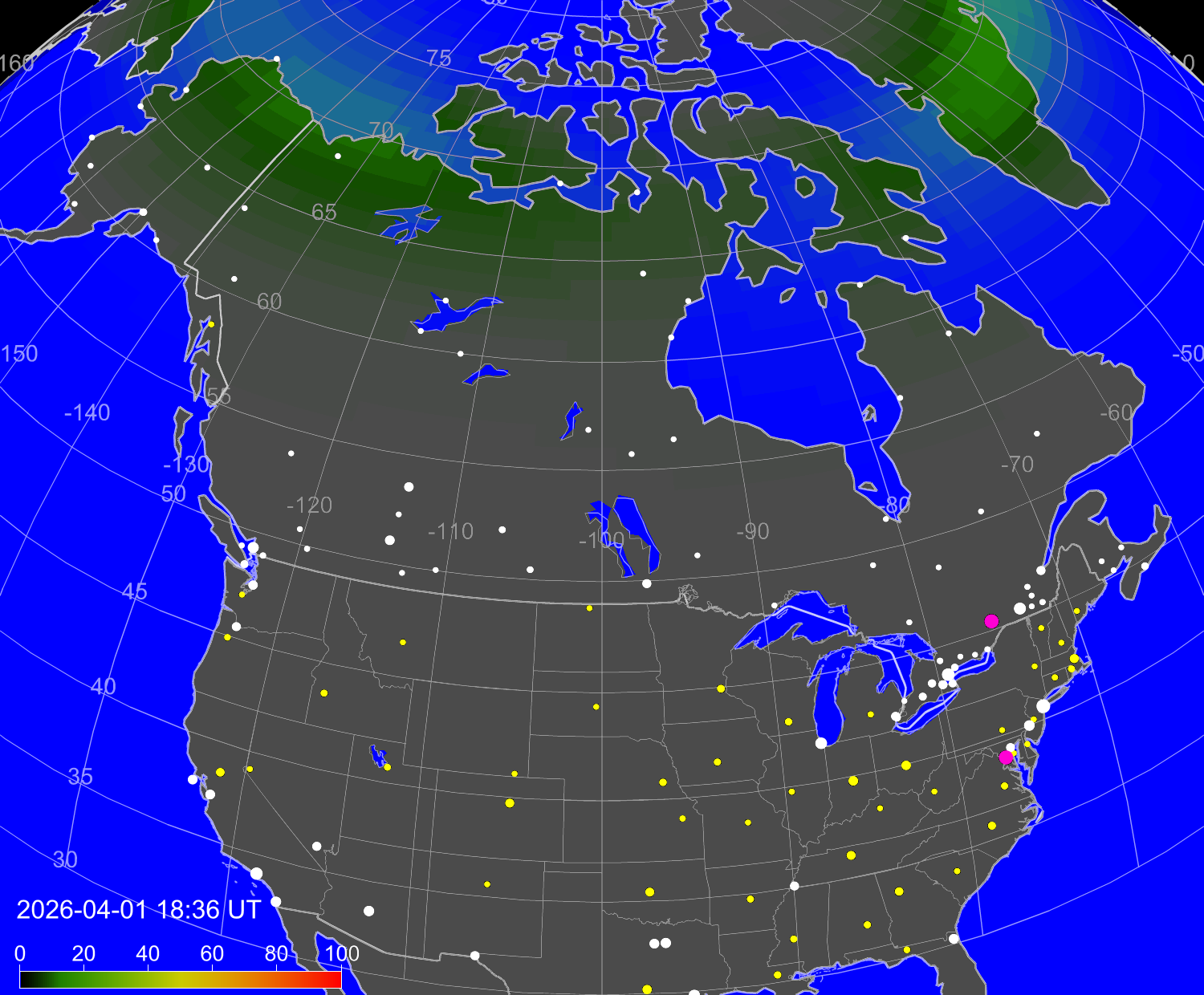 Auroral intensity index and theoretically possible latitude of observations for nighttime in the Western Hemisphere