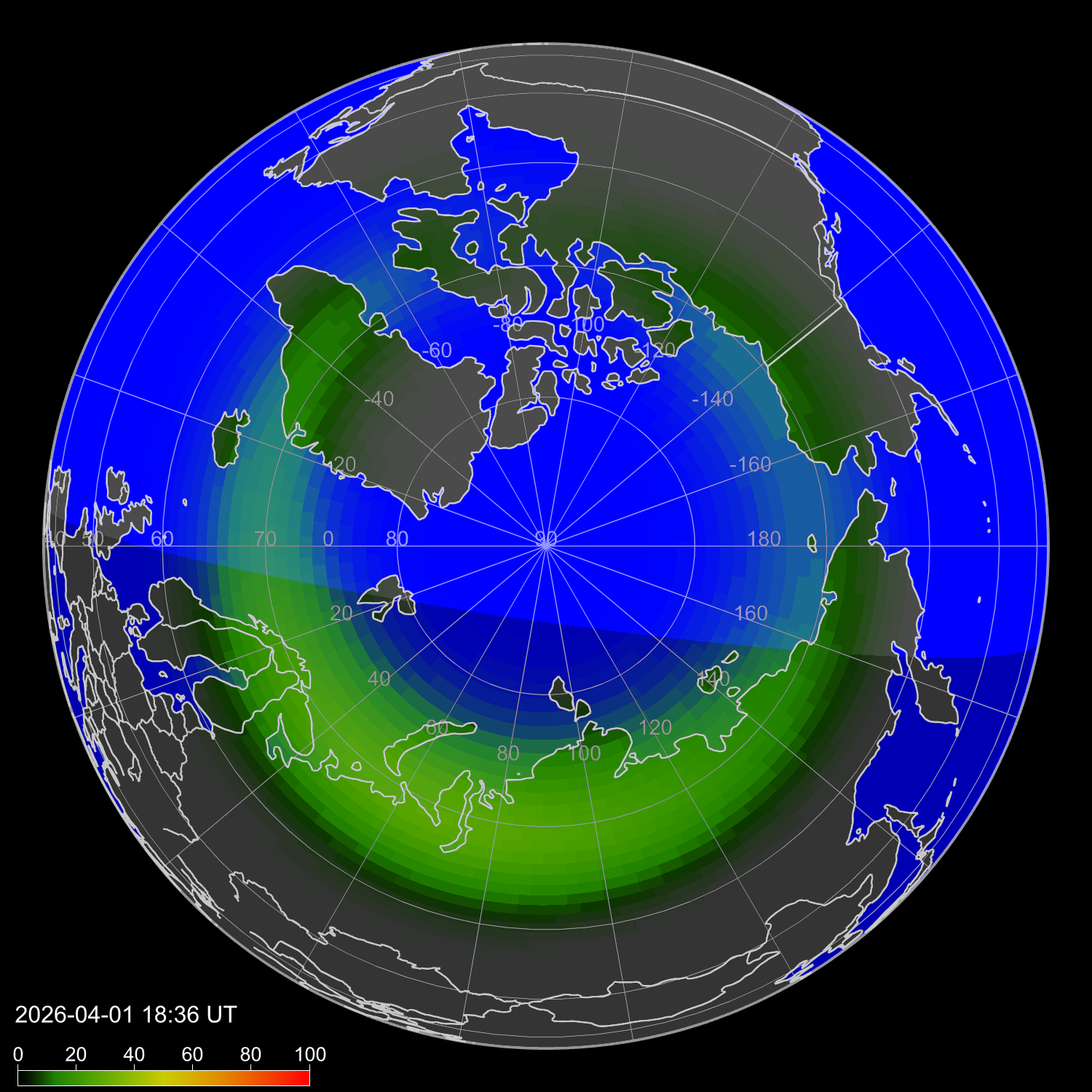 Changes and hourly forecast of the auroral intensity index from 2026-03-31 to 2026-04-01