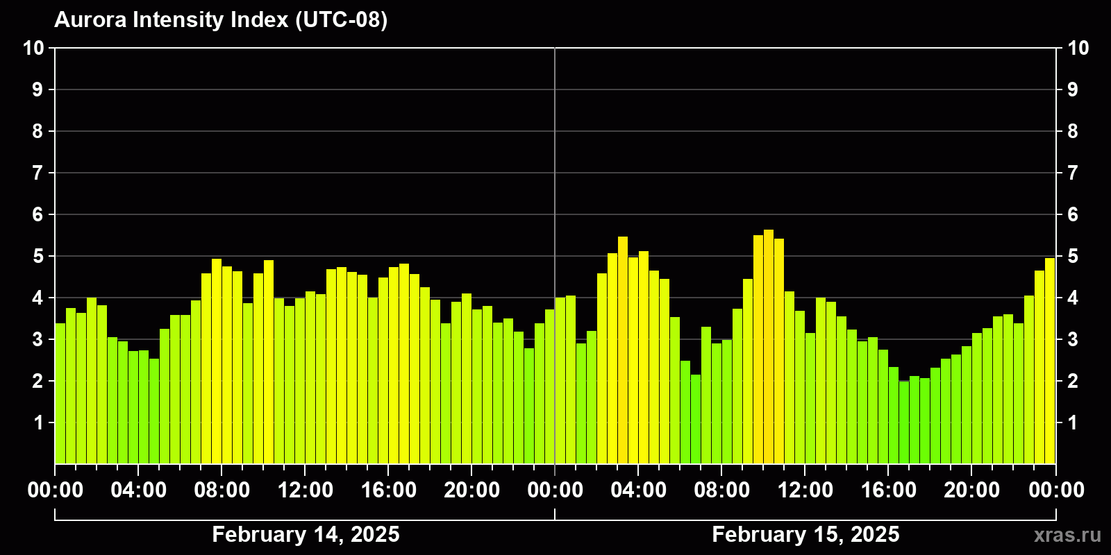 Auroral intensity index and the theoretically possible latitude of observations for nighttime in the Western Hemisphere as of 2025-02-15 23:48 (end of day) local time