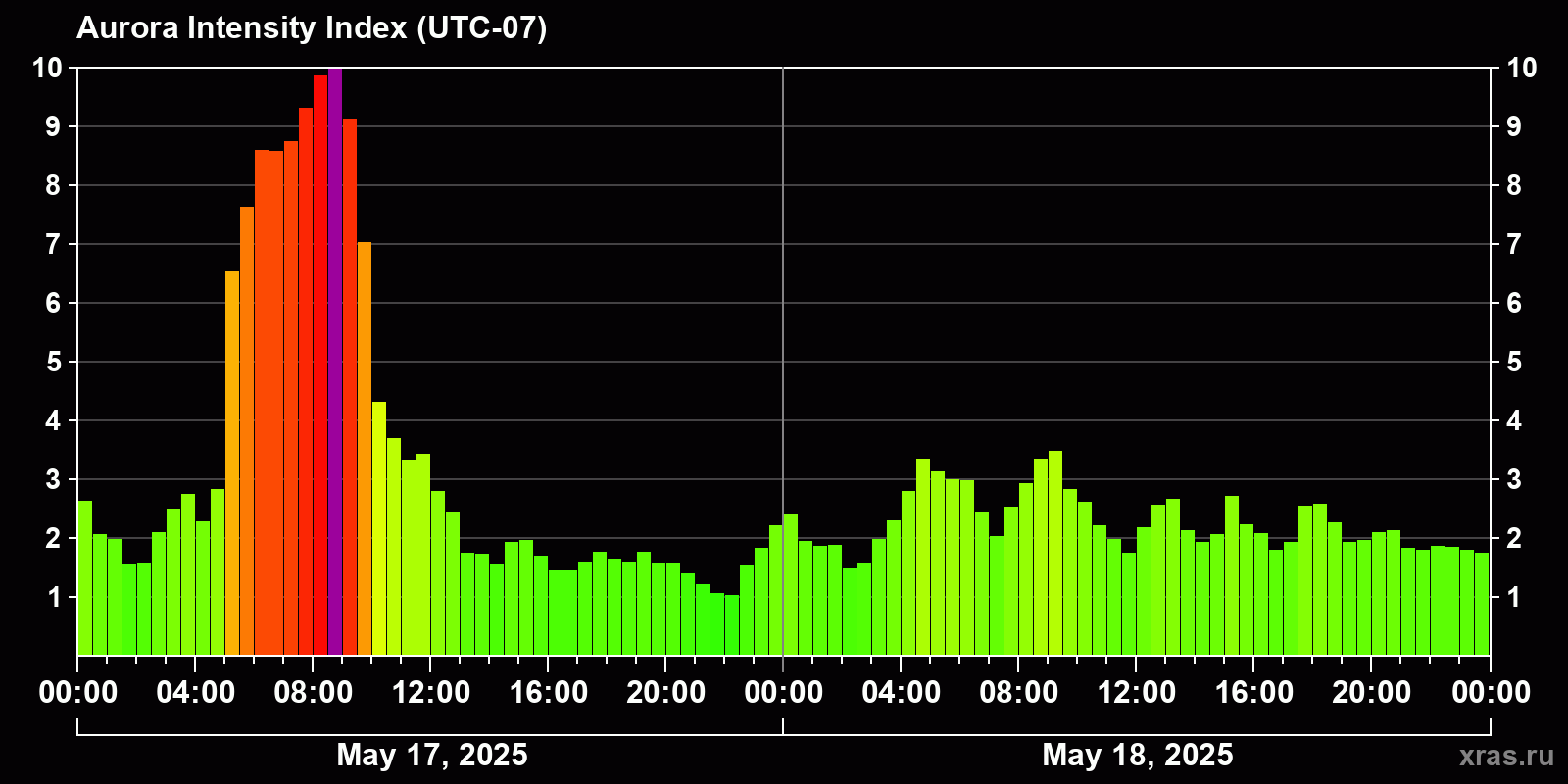 Changes in the auroral intensity index from 2025-05-17 to 2025-05-18 local time