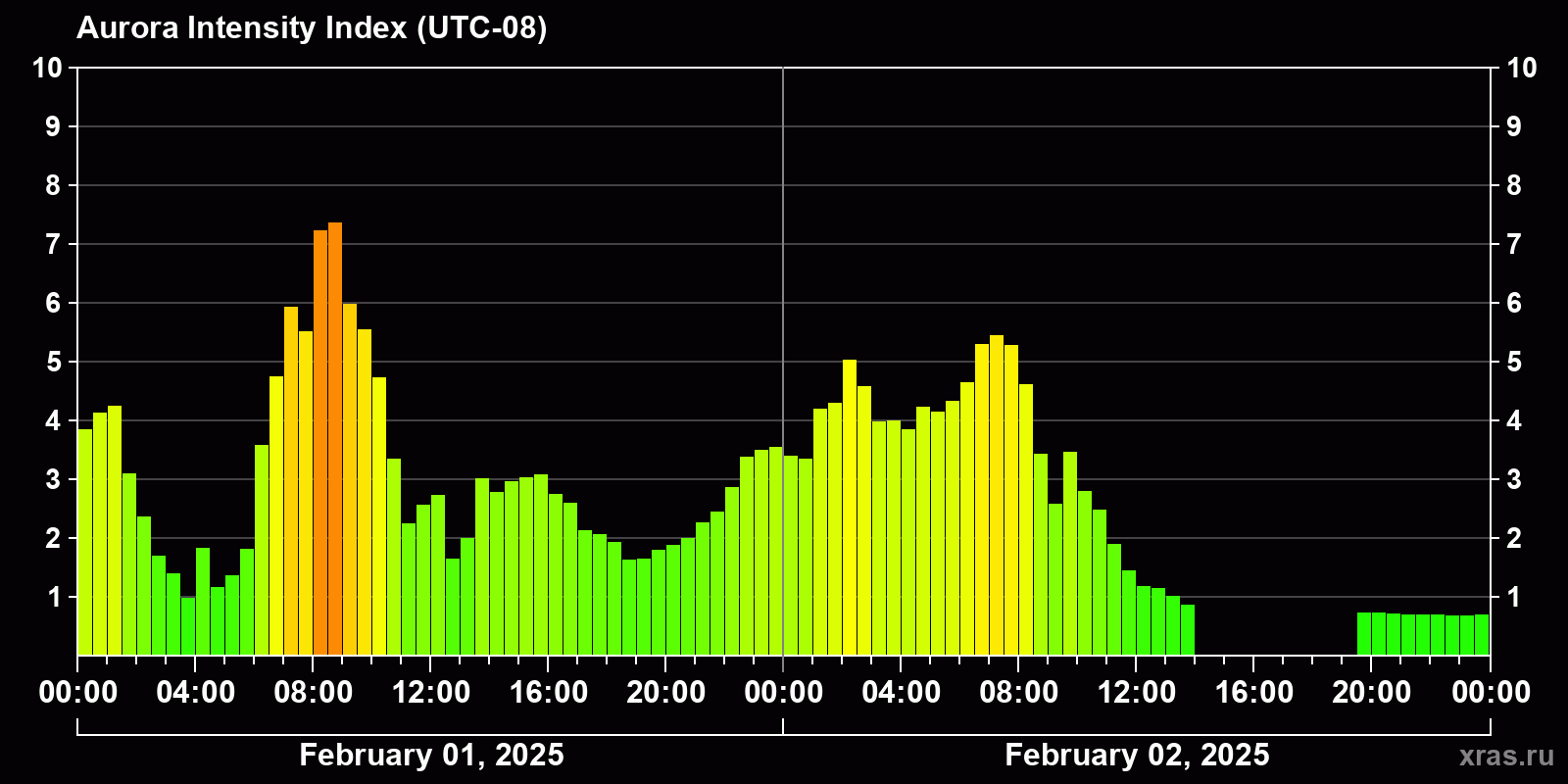 Changes in the auroral intensity index from 2025-02-01 to 2025-02-02 local time