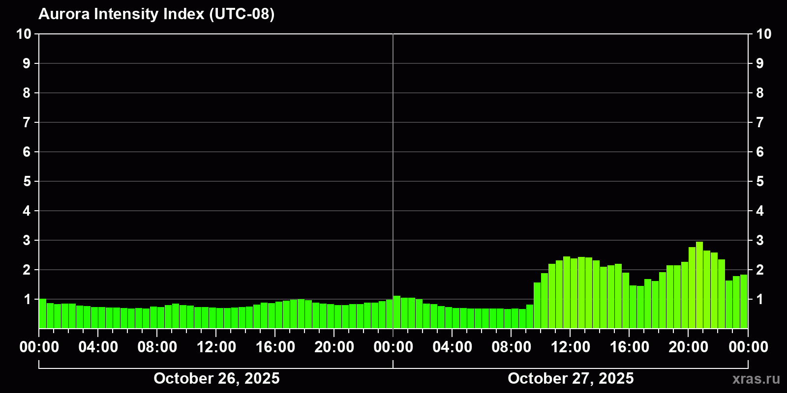 Changes in the auroral intensity index from 2025-10-26 to 2025-10-27 local time