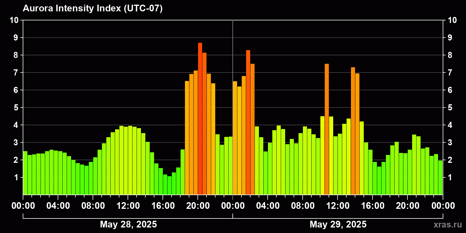 Auroral intensity index and the theoretically possible latitude of observations for nighttime in the Western Hemisphere as of 2025-05-29 23:45 (end of day) local time