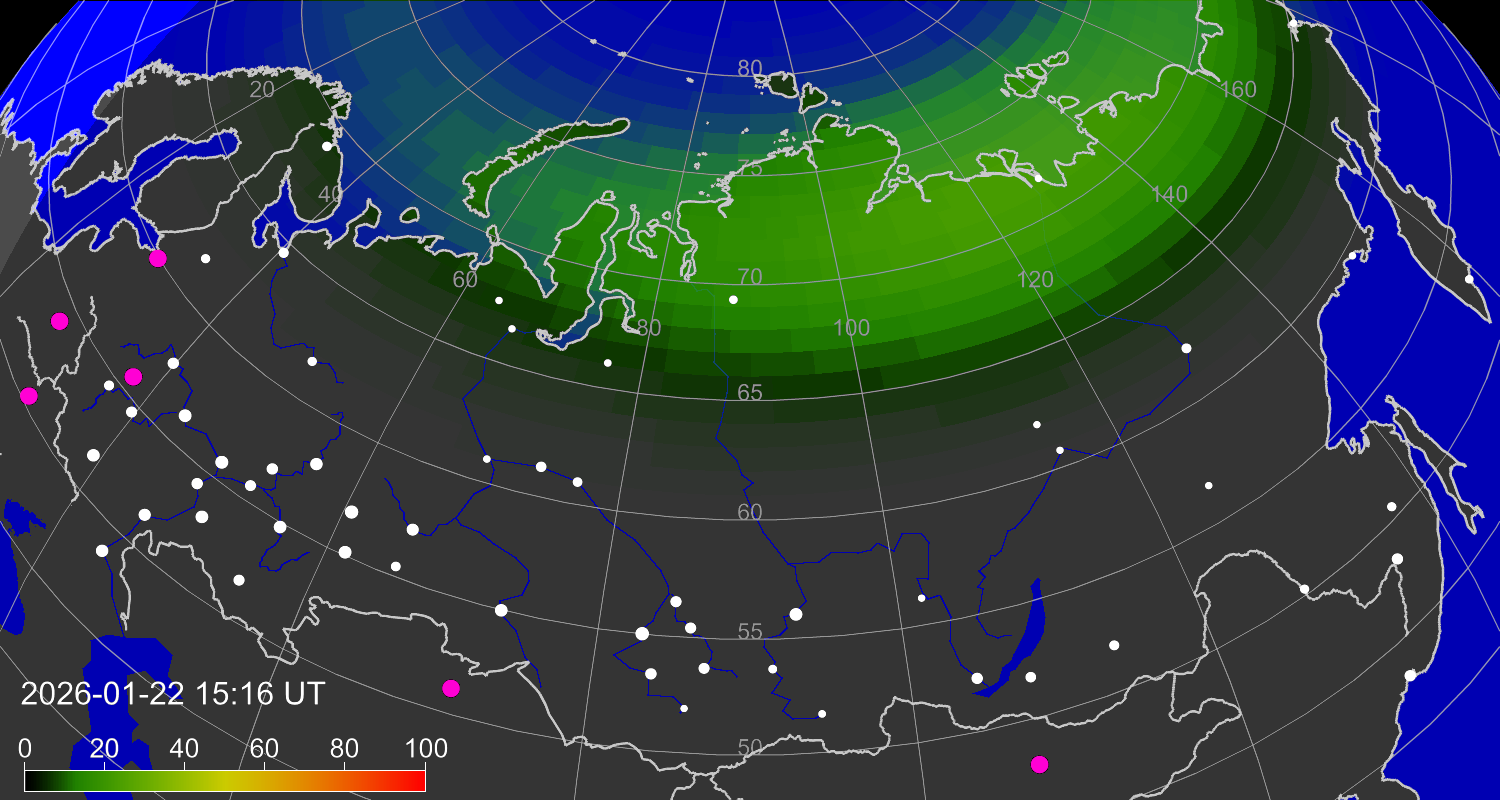 Индекс интенсивности полярных сияний и теоретически возможная широта наблюдений для ночного времени в восточном полушарии