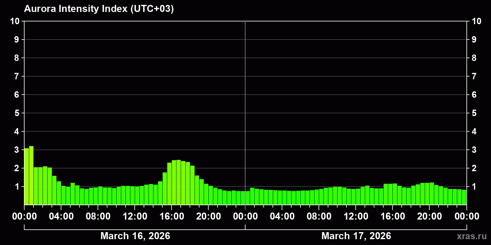 Auroral intensity index and the theoretically possible latitude of observations for nighttime in the Estern Hemisphere as of 2026-03-17 23:46 (end of day) local time