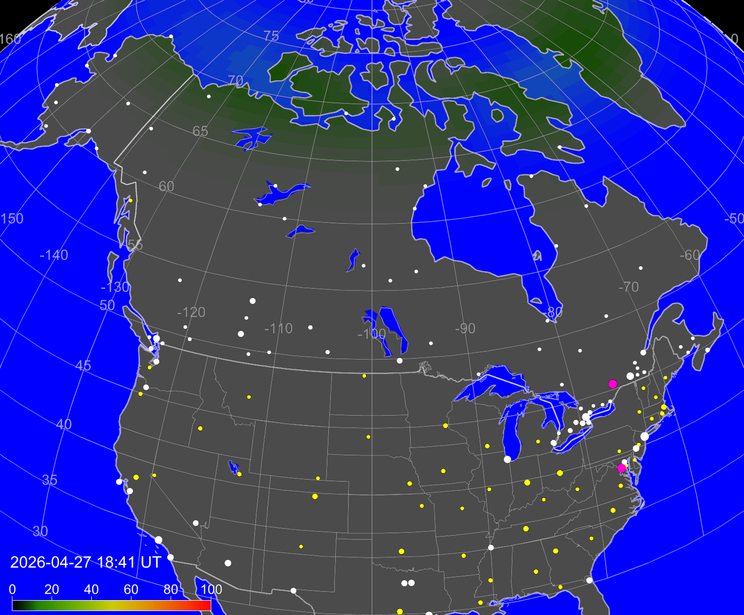 Auroral intensity index and theoretically possible latitude of observations for nighttime in the Western Hemisphere
