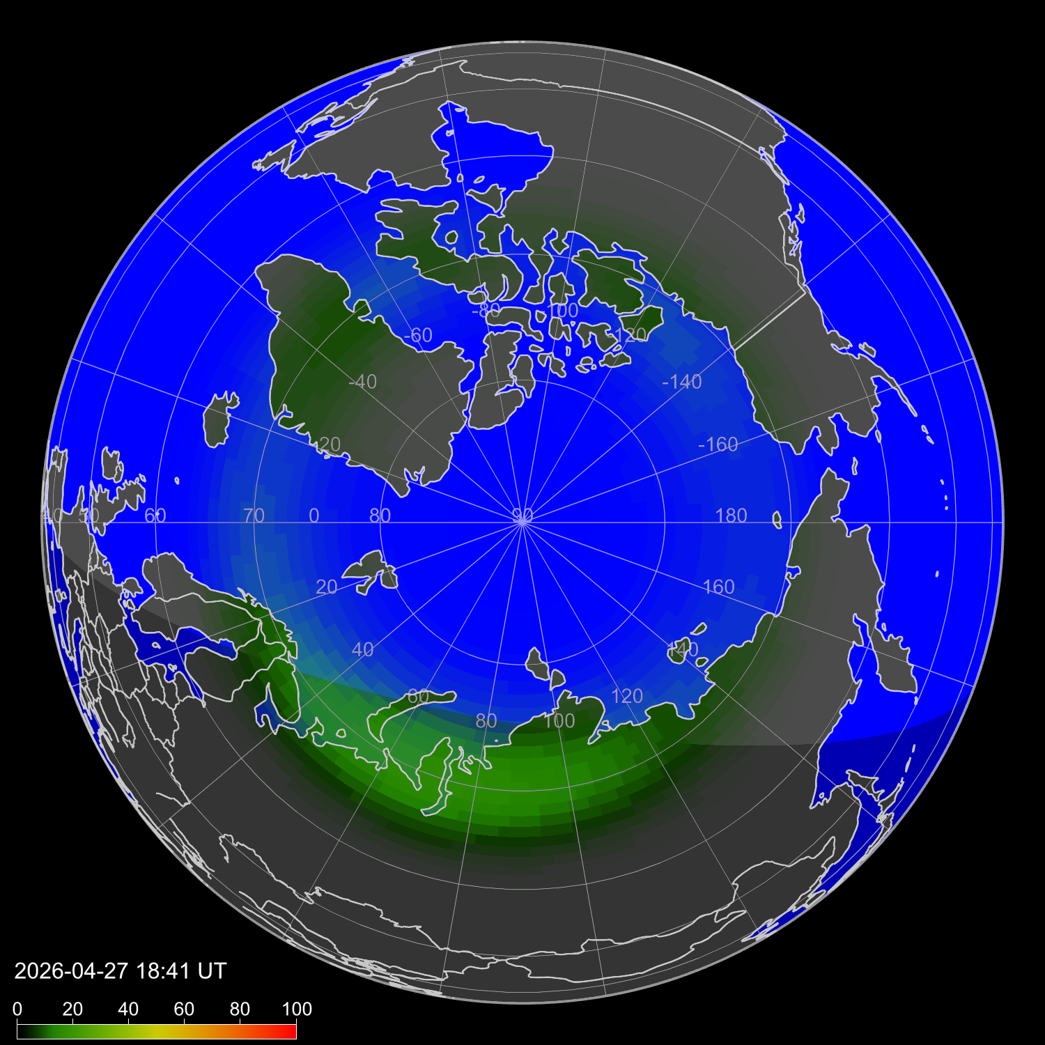 Changes and hourly forecast of the auroral intensity index from 2026-04-26 to 2026-04-27