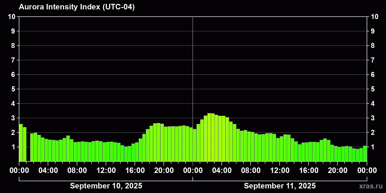 Changes in the auroral intensity index from 2025-09-10 to 2025-09-11 local time