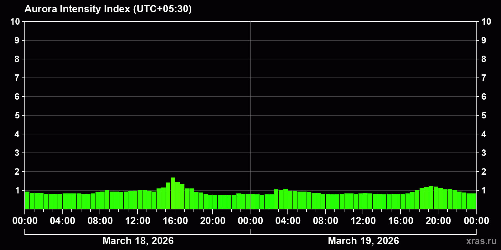 Changes in the auroral intensity index from 2026-03-18 to 2026-03-19 local time