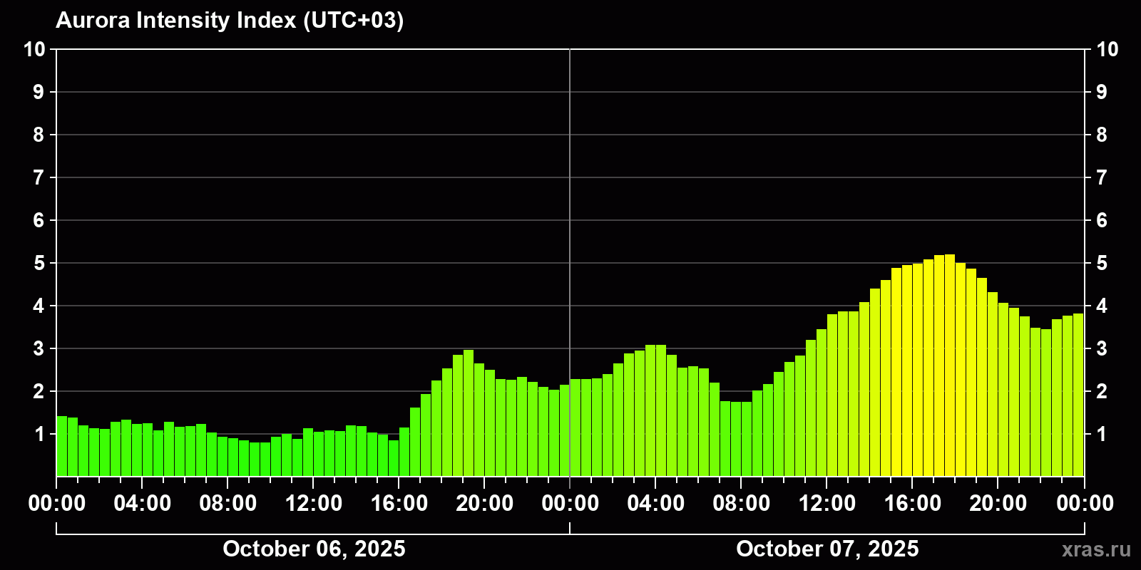 Auroral intensity index and the theoretically possible latitude of observations for nighttime in the Estern Hemisphere as of 2025-10-07 23:50 (end of day) local time