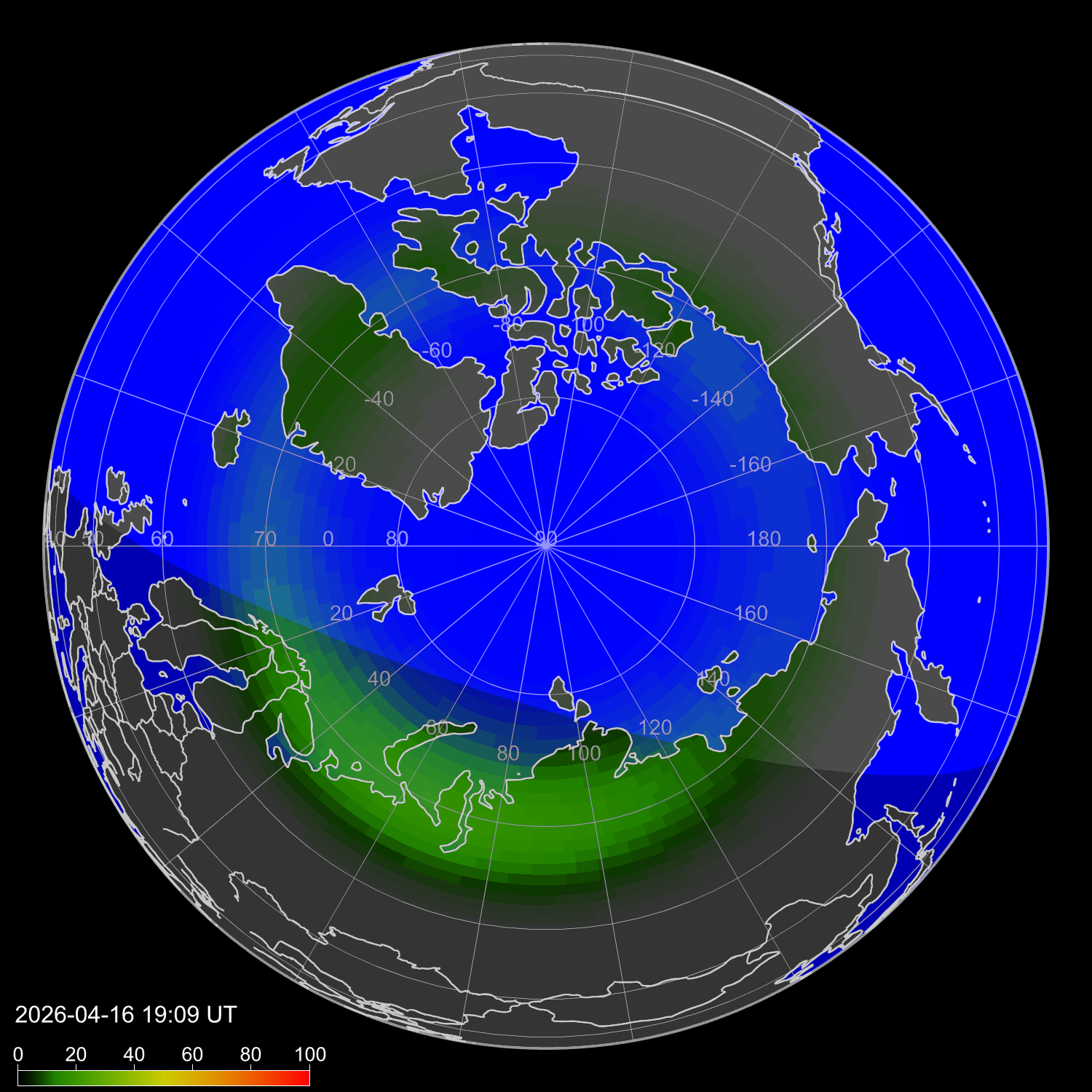 Changes and hourly forecast of the auroral intensity index from 2026-04-15 to 2026-04-16
