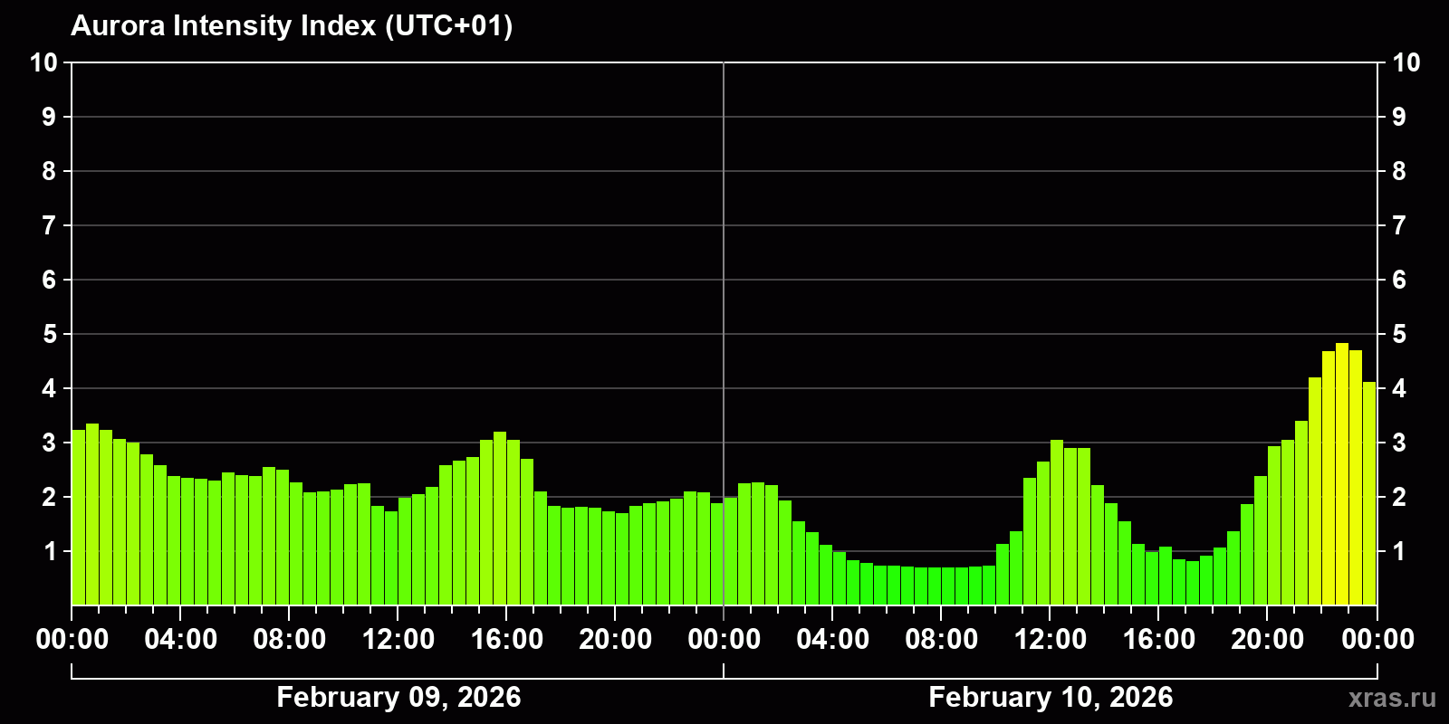Auroral intensity index and the theoretically possible latitude of observations for nighttime in the Estern Hemisphere as of 2026-02-10 23:52 (end of day) local time