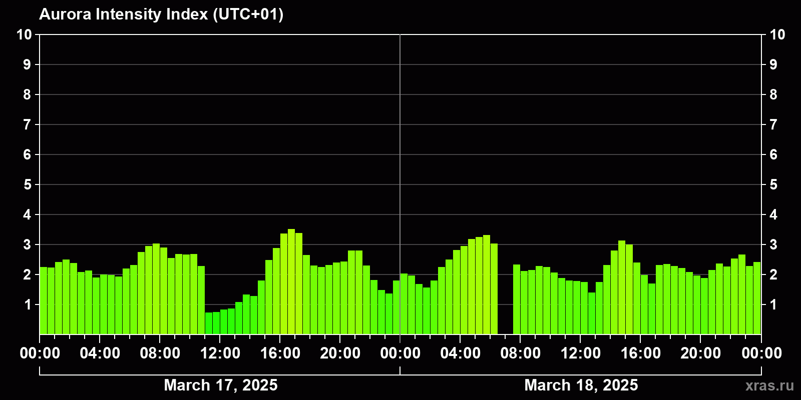Changes in the auroral intensity index from 2025-03-17 to 2025-03-18 local time