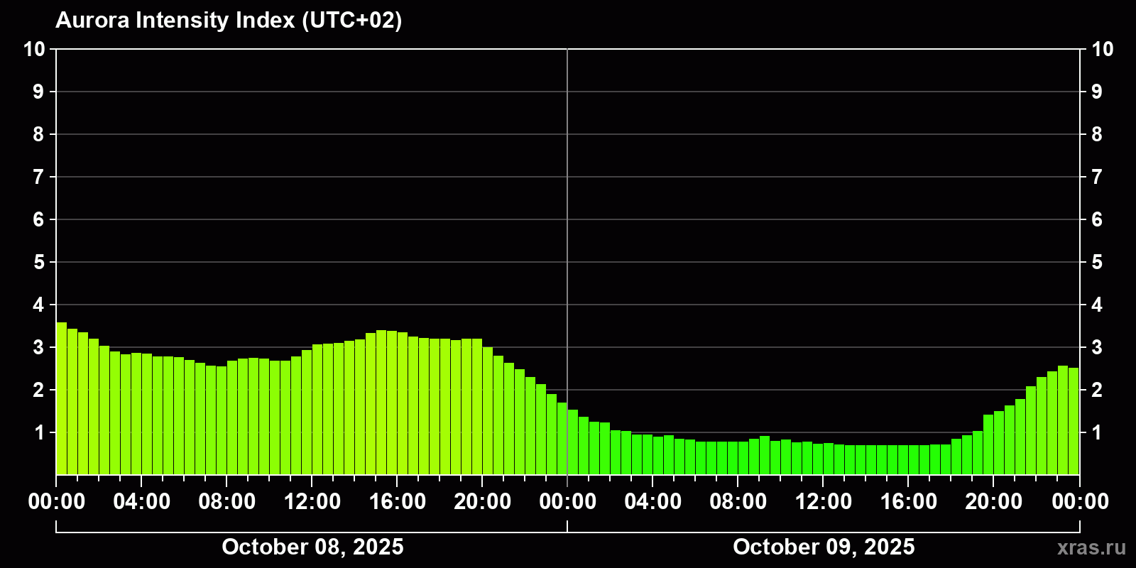 Auroral intensity index and the theoretically possible latitude of observations for nighttime in the Estern Hemisphere as of 2025-10-09 23:45 (end of day) local time