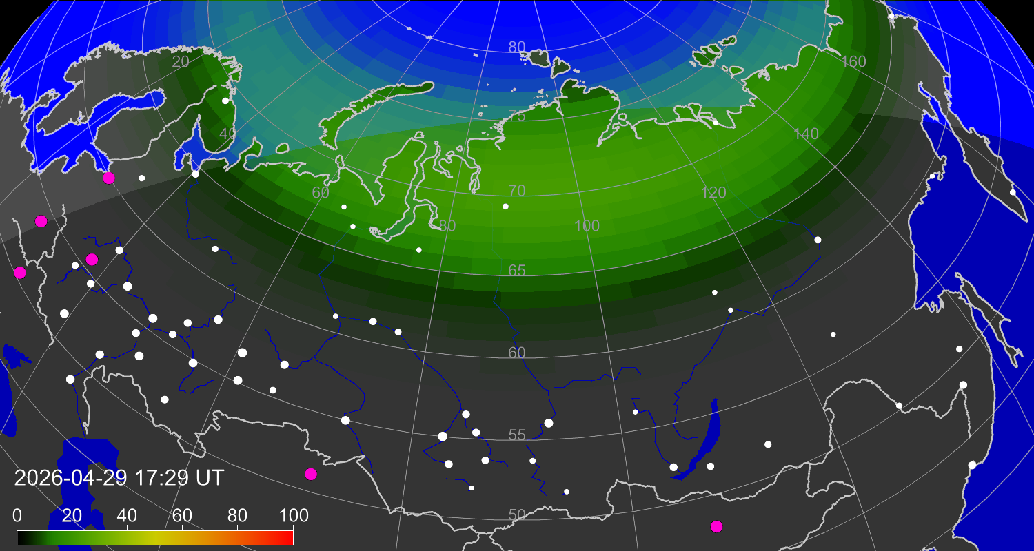 Probability of northern lights (auroras) in cities of Russia