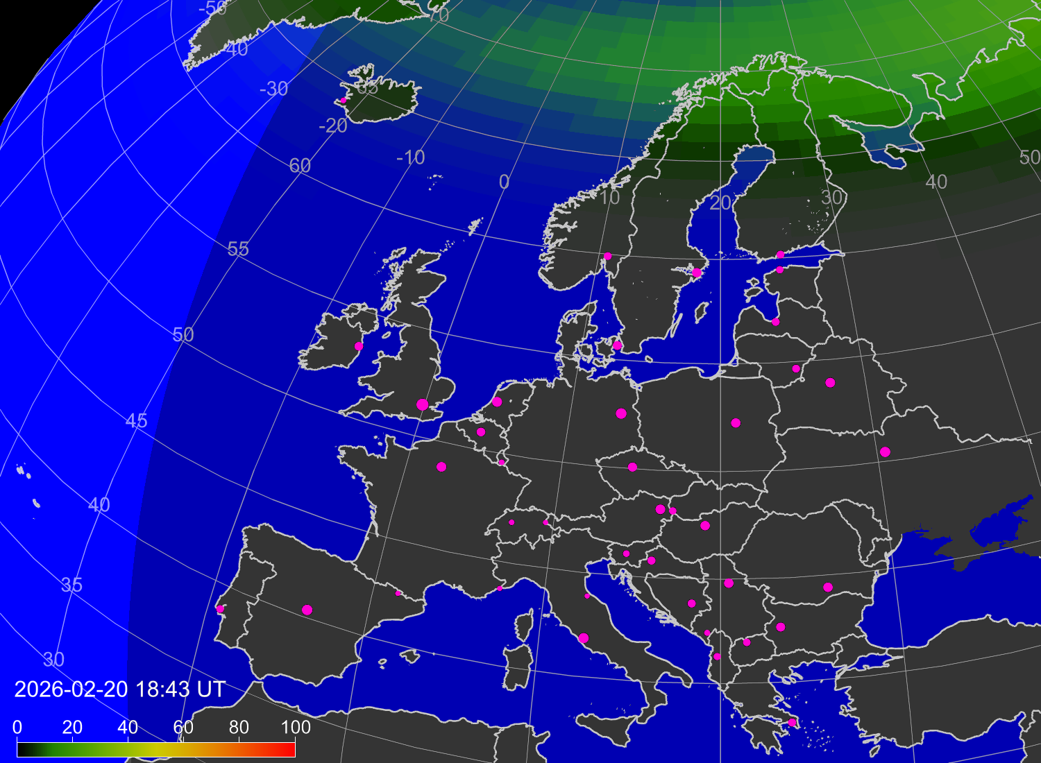 Индекс интенсивности полярных сияний и теоретически возможная широта наблюдений для ночного времени в восточном полушарии