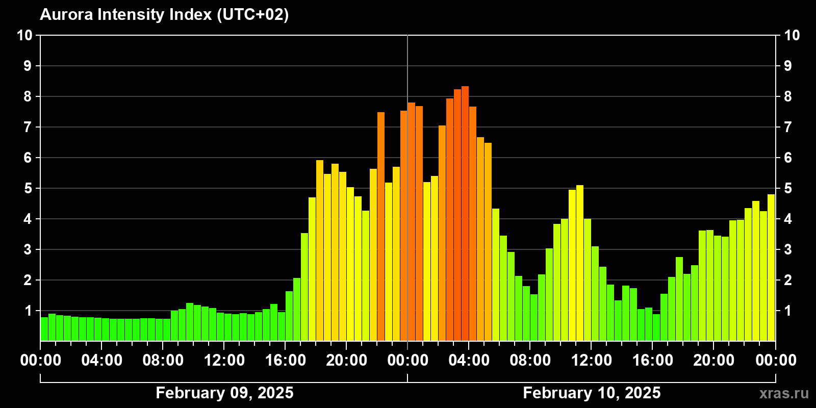 Auroral intensity index and the theoretically possible latitude of observations for nighttime in the Estern Hemisphere as of 2025-02-10 23:59 (end of day) local time